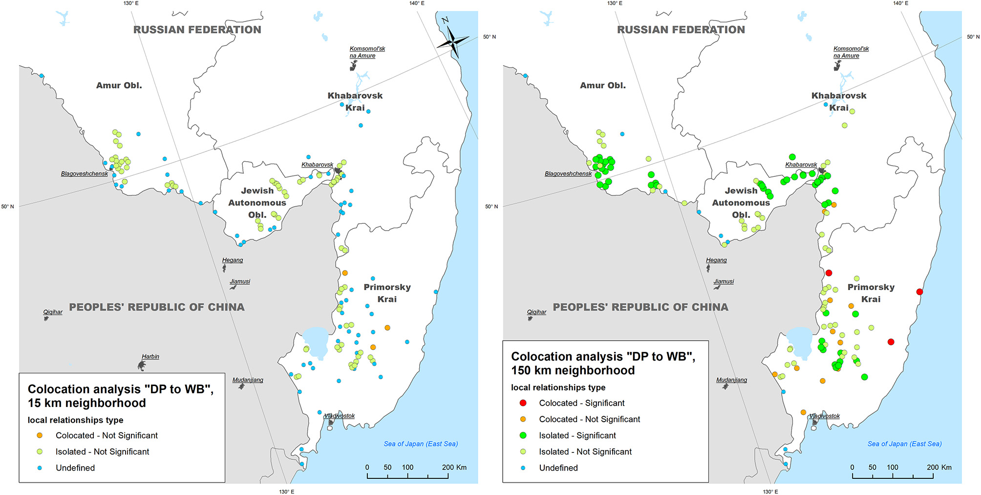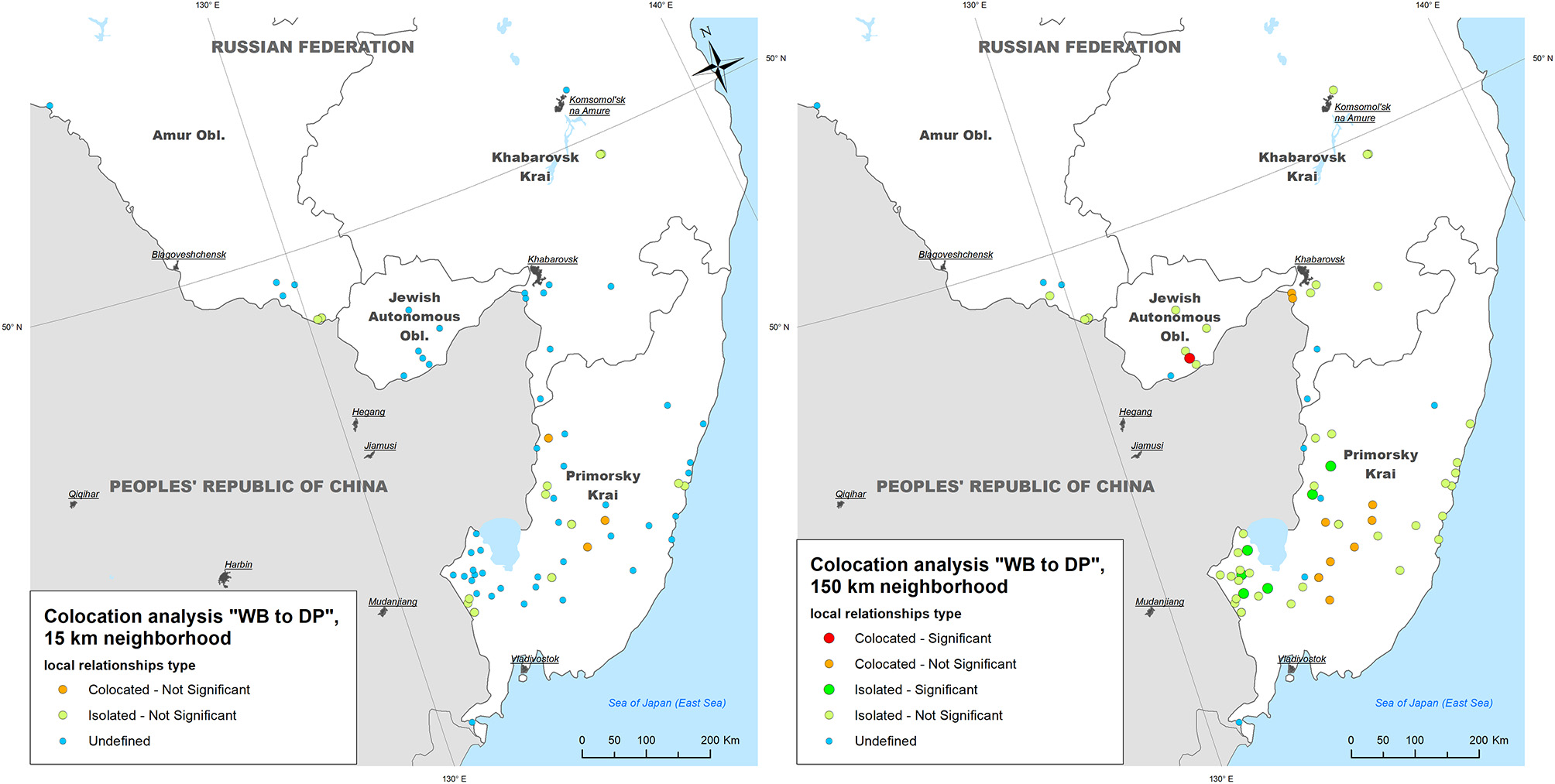 - Within a neighborhood of 150 km radius only one (1.4%) WB outbreak was statistically significant collocated with DP outbreaks (in Jewish Autonomous Oblast), and six (8.5%) WB outbreaks were statistically significant isolated (in Primorsky Krai), while 10 (14.0%) and 43 (60.6%) WB outbreaks were statistically non-significant collocated and isolated, respectively (Figure 5).