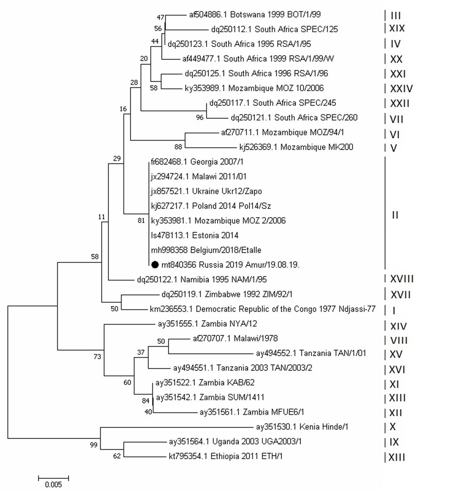 The phylogenetic analysis of ASFV isolates of the Amur/19.08.19 strain was based on a fragment of the B646L gene sequence, which encodes the P72 protein. The analysis revealed that this strain belongs to the second genotype. This genotype was initially widely spread in Eastern Europe, when it was first reported in Georgia, in 2007. Genotypic affiliation of the Amur/19.08.19 strain was also confirmed by calculating the phylogenetic tree using the nucleotide sequencing of the E183L gene, encoding the P54 protein (Figure 6).