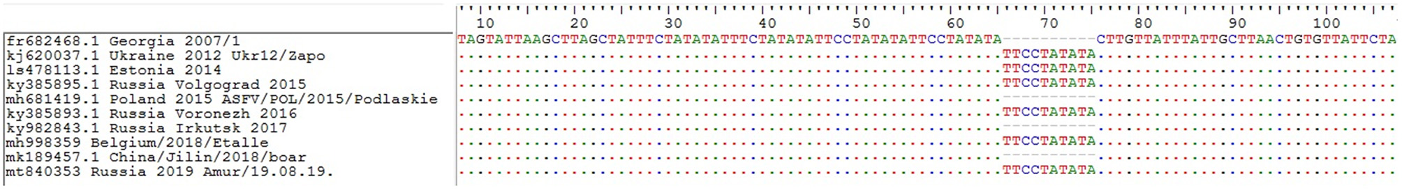 TheB646L, E183L, I73R/I329L, B602L, EP402R, and MGF 505-9R gene sequences of the Amur/19.08.19 strain were deposited in GenBank under the accession numbers MT840357, MT840356, MT840354, MT840352, MT840355, and MT840353, respectively.