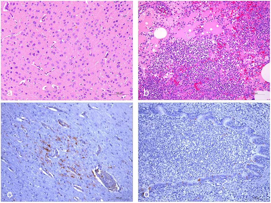 Briefly, histopathologic findings in the brain included neuronal degeneration and necrosis, perivascular edema (Figure 1a). Interstitial pneumonia with infiltrates of inflammatory cells comprising lymphocytes and macrophages can be seen in the bronchus (Figure 1b). Immunohistochemical analysis revealed the CDV antigen in some areas of the lung and brain (Figures 1c,d). Additionally, generalized more severe lymphocyte depletion was found in the spleen, liver, intestine, while no obvious pathological changes were found in kidney (data not shown).