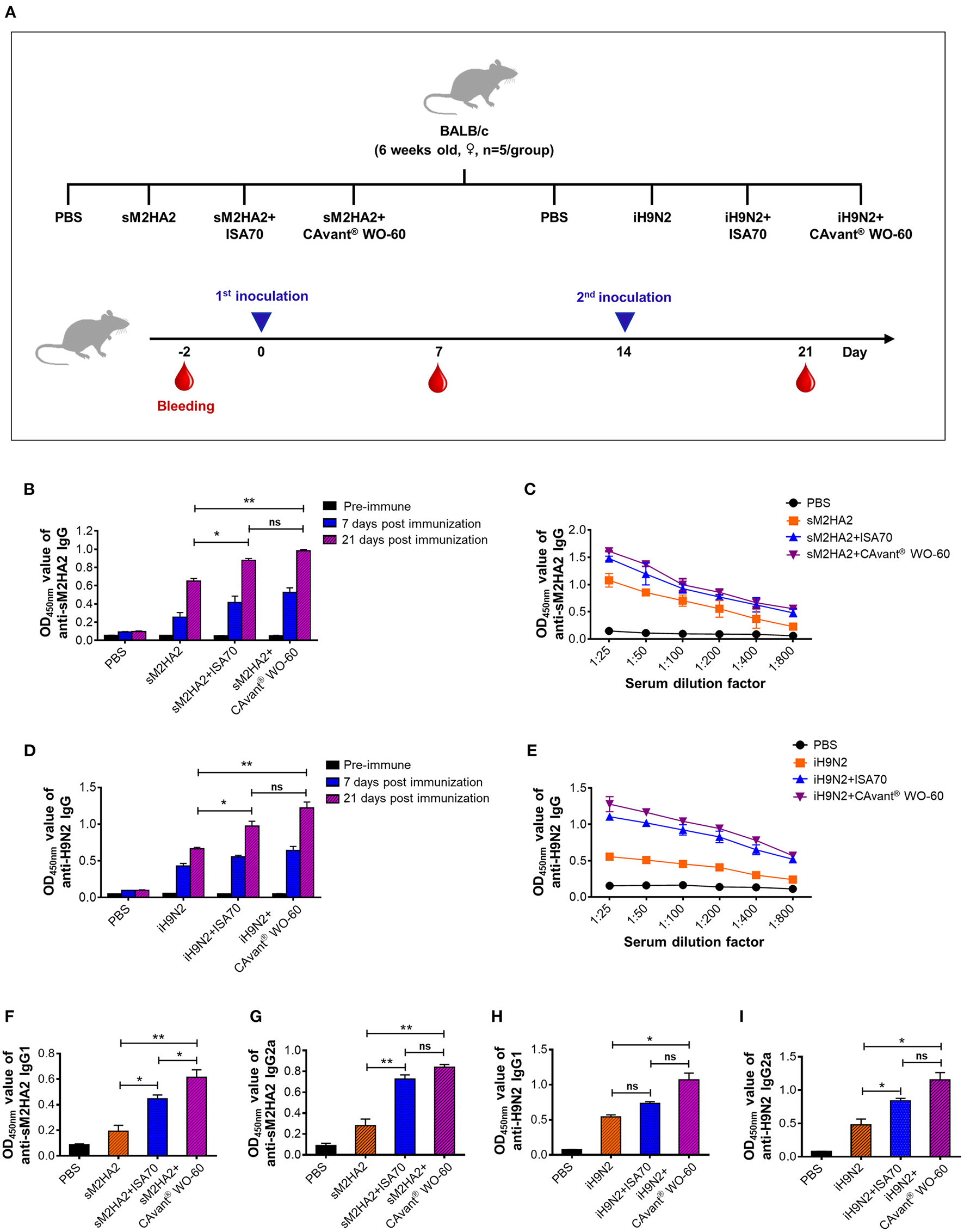 Evaluation of the antigen-specific humoral immune response in mice. (A) Schematic depiction of mice experiment strategy. Mice were intramuscularly administered twice every other week. Serum samples were collected on dayā2 (pre-serum), day 7, and day 21 after first immunization. The antibody response levels were detected by indirect ELISA. (B) Kinetics of appearance IgG at 1:100 serum dilution ratio and (C) comparative serum IgG antibody titers at 21 days post-immunization upon immunization with PBS, sM2HA2, sM2HA2+ISA 70 VG, and sM2HA2+CAvantĀ® WO-60. (D) Kinetics of appearance IgG at 1:100 serum dilution ratio and (E) comparative serum IgG antibody titers at 21 days post-immunization upon immunization with PBS, iH9N2, iH9N2+ISA 70 VG, and iH9N2+CAvantĀ® WO-60. (F) Systemic IgG1, (G) Systemic IgG2a antibody responses specific to sM2HA2 in the sera at day 21 after immunization with PBS, sM2HA2, sM2HA2+ISA 70 VG, and sM2HA2+ CAvantĀ® WO-60. (H) Systemic IgG1, (I) Systemic IgG2a antibody responses specific to iH9N2 in the sera at day 21 after immunization with PBS, iH9N2, iH9N2+ISA 70 VG, and iH9N2+CAvantĀ® WO-60. The bar shows the mean ± SD of n = 5 samples. Data from one representative experiment of two independent experiments are shown. Comparison of groups was analyzed by ANOVA and Tukey's multiple comparisons test. *p < 0.05, **p < 0.01 between CAvantĀ® WO-60 adjuvanted, ISA 70 VG adjuvanted, and antigen-only group.