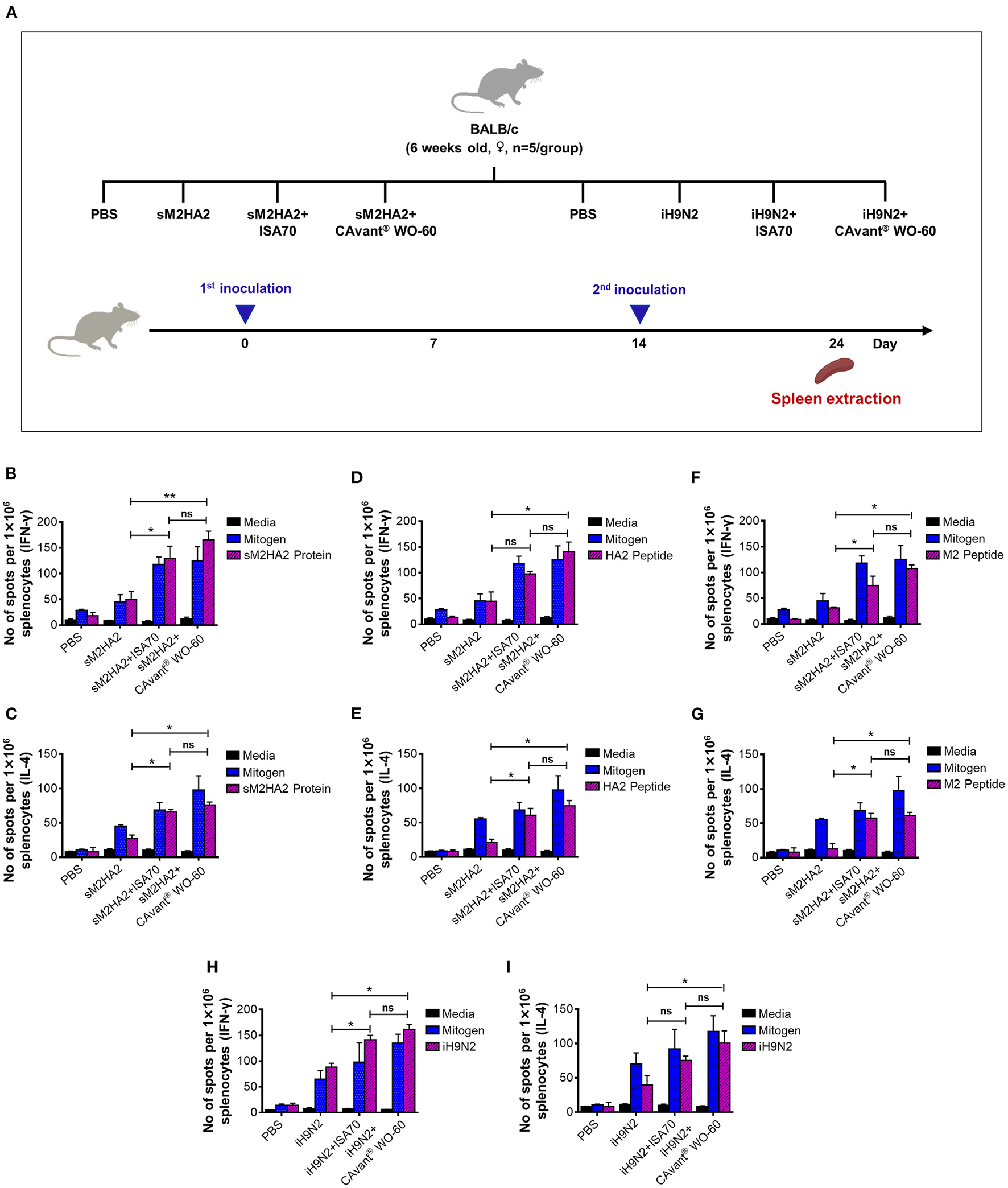 The above-described groups of mice were sacrificed 24 days after the first immunization and their splenocytes were subjected to ELISPOT assays to quantify the numbers of antigen-specific cells that secreted interferon (IFN)-γ and interleukin (IL)-4 (Figure 2A). IFN-γ is a representative Th1 cytokine that is also expressed by cytotoxic T lymphocytes, whereas IL-4 is a Th2 cytokine. Thus, the splenocytes from mice immunized with sM2HA2 were stimulated with sM2HA2 or M2 or HA2 peptides. The percentages of IFN-γ and IL-4-secreting splenocytes were higher in mice immunized with sM2HA2 emulsified in CAvantĀ® WO-60 than in mice immunized with sM2HA2 alone or with sM2HA2 emulsified in ISA 70 VG (Figures 2BāG). Similar results were observed when the splenocytes from mice immunized with iH9N2 were stimulated with whole H9N2 antigen. The percentages of IFN-γ and IL-4-secreting splenocytes were again higher in mice immunized with iH9N2 emulsified in CAvantĀ® WO-60 than in mice immunized with the inactivated virus alone or with iH9N2 emulsified in ISA 70 VG (Figures 2H,I). These results provide evidence that immunization with sM2HA2 emulsified in CAvantĀ® WO-60 enhanced antigen-specific T-cell immune responses to a similar or even higher degree than immunization with sM2HA2 emulsified in the control adjuvant ISA 70 VG.