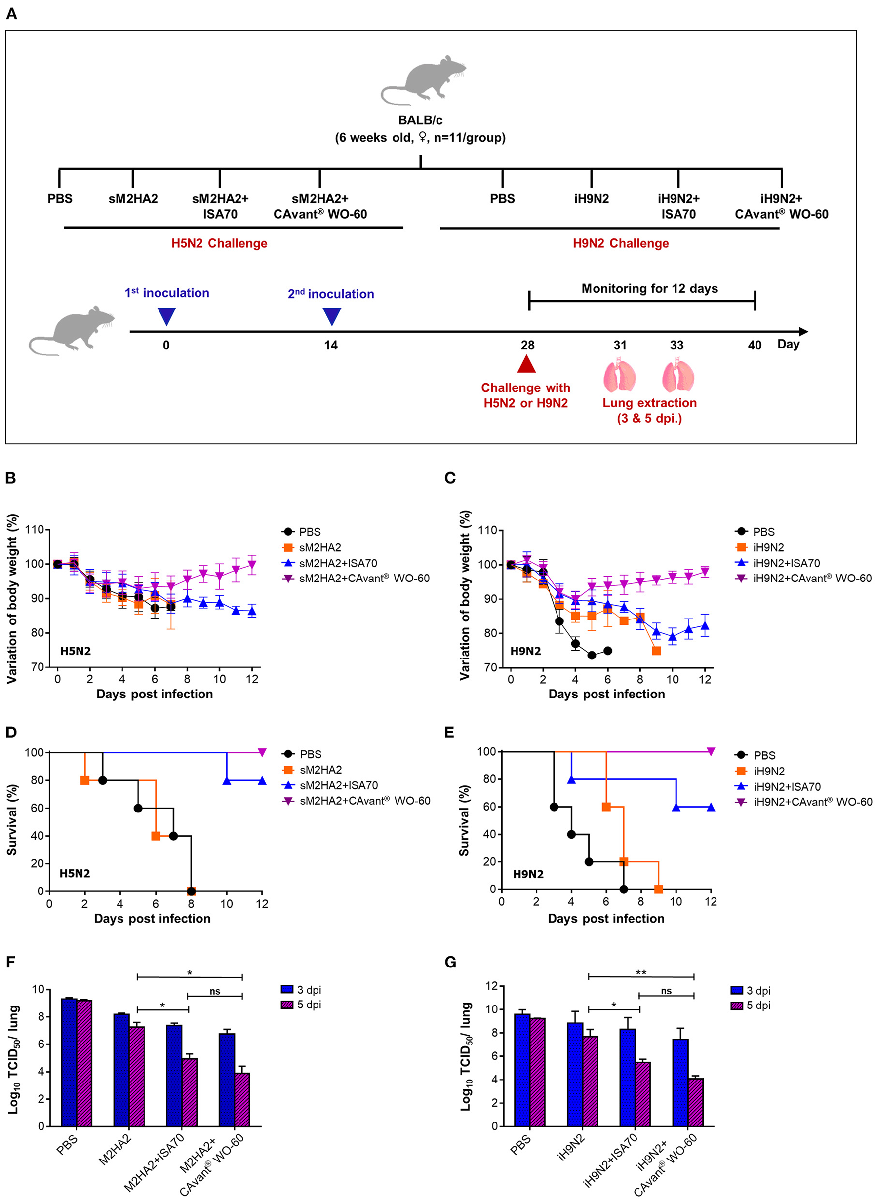 Protective efficacy against lethal influenza virus infection in mice. (A) Schematic depiction of mice experiment strategy. BALB/c mice were intramuscularly administrated twice every other week. Mice were intranasally challenged with 10LD50 of mouse-adapted A/Aquatic bird/Korea/W81/2005(H5N2) and A/Chicken/Korea/01310/2001(H9N2) at 2 weeks after the second immunization. (B,C) The changes in body weight and (D,E) survival rate after performing lethal challenges with H5N2 and H9N2, respectively, were monitored for 12 days. (F,G) Virus titers in the lung tissues were investigated at 3 and 5 DPI by TCID50 in the MDCK cell following infection with A/Aquatic bird/Korea/W81/2005(H5N2) and A/Chicken/Korea/01310/2001(H9N2), respectively. The bar shows the mean ± SD of n = 5 or n = 3 samples. Data from one representative experiment of two independent experiments are shown. Comparison of groups was analyzed by ANOVA and Tukey's multiple comparisons test. *p < 0.05, **p < 0.01 between CAvant® WO-60 adjuvanted, ISA 70 VG adjuvanted, and antigen-only group.