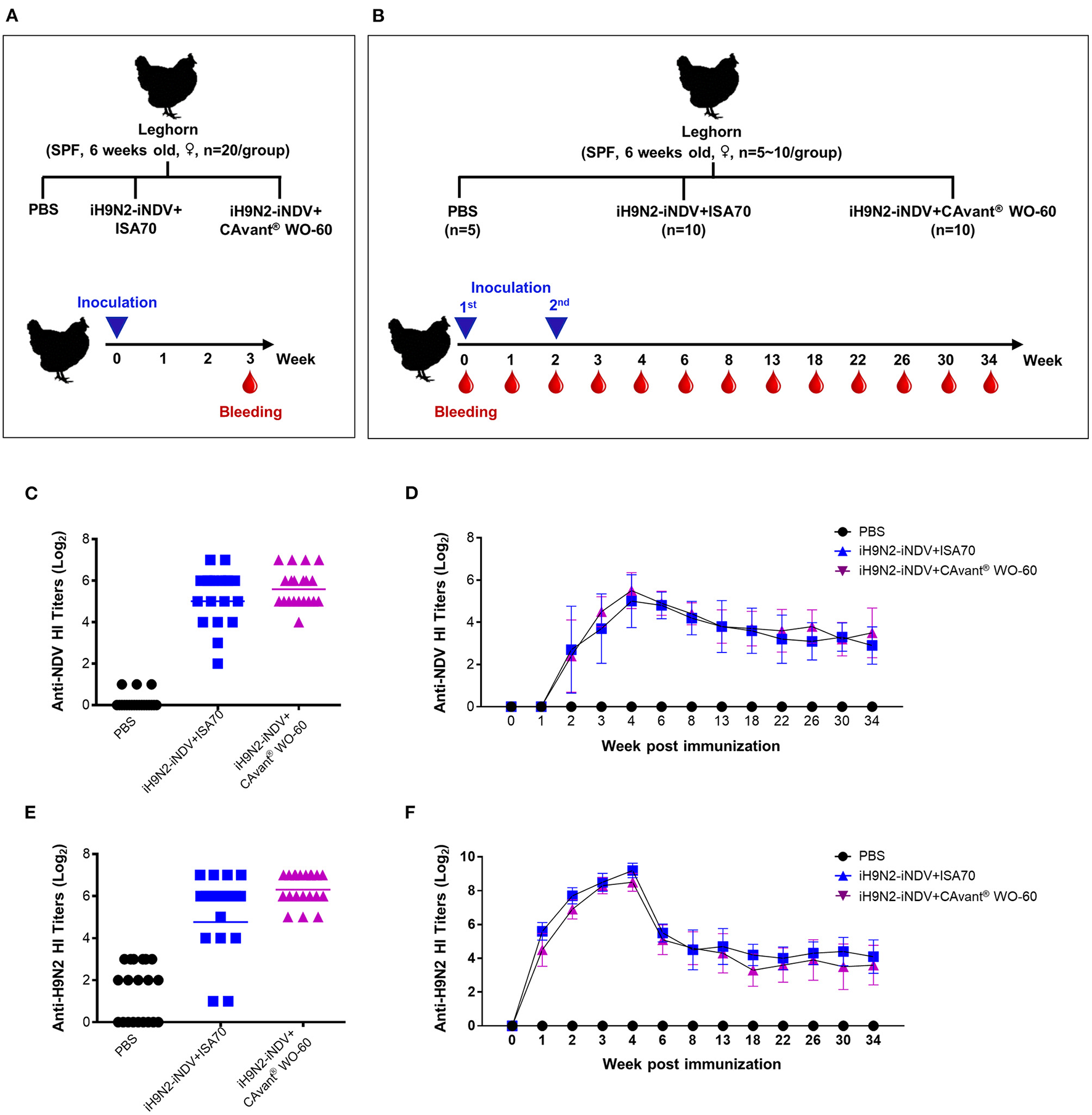 To further assess the effect of the CAvantĀ® WO-60 adjuvant on host animals, chickens were immunized i.m. once (priming) or twice (boosting) with a bivalent vaccine consisting of iNDV plus iH9N2 emulsified in CAvantĀ® WO-60 or ISA 70 VG at a ratio of 3:7 (v/v). Control chickens were injected with PBS, and serum samples were collected from individual birds to determine their homologous HI titers (Figures 4A,B).