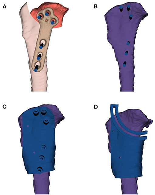 Figure 1. Medial aspect of the virtual tibia model for the customized three-dimensional printing surgical guide design. (A) The proximal tibial plateau segment is virtually rotated. (B) A TPLO plate is placed and a virtual trajectory is created according to the screw insertion direction. (C) The rotated proximal tibial plateau segment is placed back, and a drill guide template is created corresponding to the screw trajectory. (D) A saw guide template is created with the diameter based on the preoperative planning. TPLO, tibial plateau leveling osteotomy.
