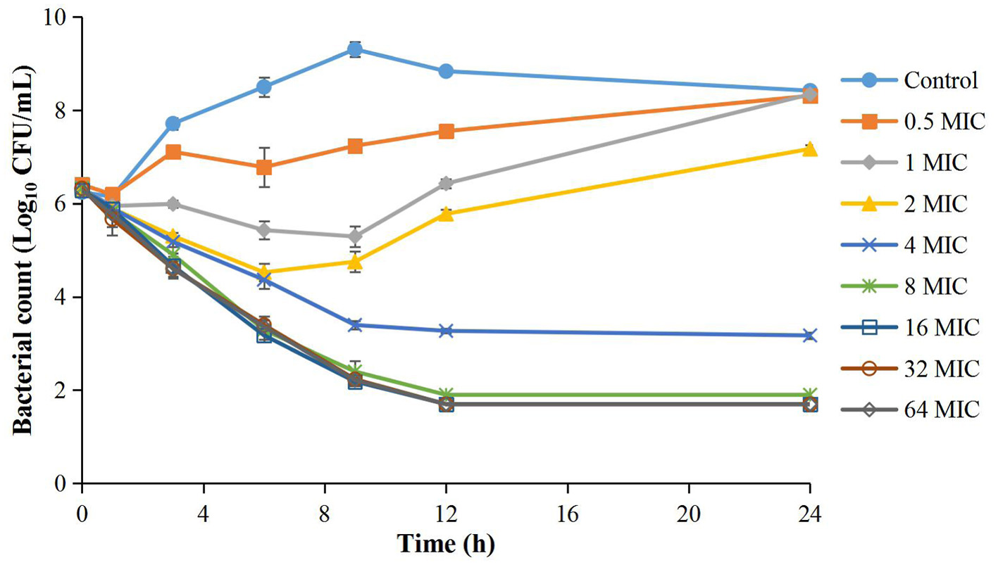 The MIC test methods for serum and TCF samples were the same as in the TSB sample. For ex vivo kill curves, 5 μl exponential phase bacterial suspension (~109 CFU/ml) was added to sterilized tubes containing 0.5 ml TCF samples (for serum, 10 μl suspension was added to 1 ml serum sample) to ensure that the final bacterial concentration was about 5 × 107 CFU/ml and cultured in a humidified incubator (37°C, 5% CO2). Then, 50 μl suspension sample was removed at 0, 1, 3, 6, 9, 12, and 24 h for APP counting. The ex vivo antibacterial time-kill curves were depicted the same as described in TSB. The antibacterial effect was described as the maximum change of APP number (Log10 CFU/mL) over 24 h.