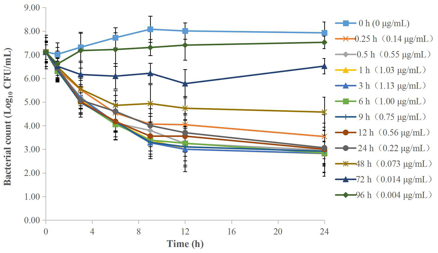 Time-kill curves of different concentrations of cefquinome against A. pleuropneumoniae in TSB. Each symbol represents the mean ± SD after the experiment had been repeated thrice.