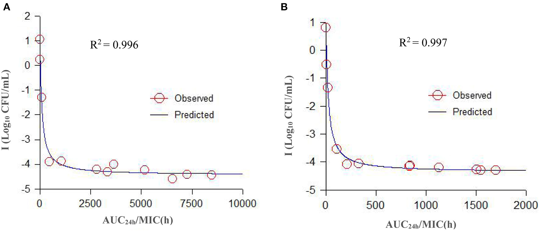 The parameters integrated by the PK/PD model are presented in Table 4. A specimen plot of AUC24h/MIC-effect (Log10 CFU/mL) is depicted in Figure 6A (serum) and Figure 6B (TCF). The values of AUC24h/MIC to produce a bacteriostatic effect, bactericidal effect, and bacterial-eradication effect were 18.94, 246.8, and 1013.23 h in serum, and 4.20, 65.81, and 391.35 h in TCF, respectively.