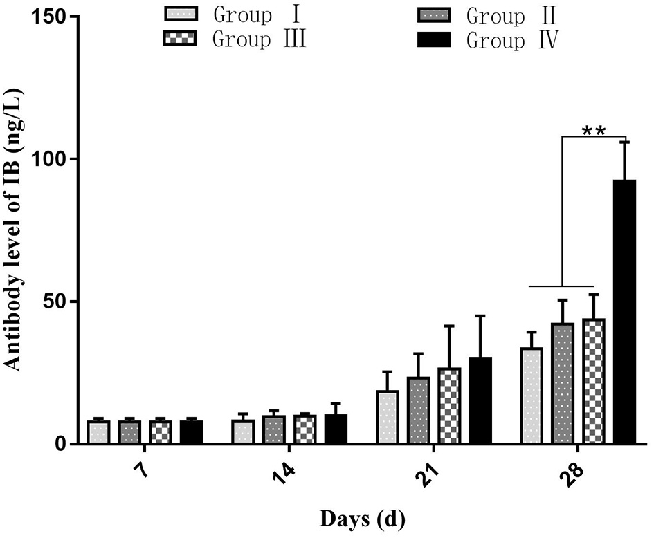 At day 7, the average value of maternally derived anti-IBV antibody titer was 4.027 ± 2.21 ng/l in all groups. The antibody level in all groups showed a significant increase with the highest level observed at day 28, and the antibody level in group IV was higher (p < 0.01) than other three groups. At day 14 and 21, the antibody level showed no difference (p > 0.05) among the four groups, as shown in Figure 1.