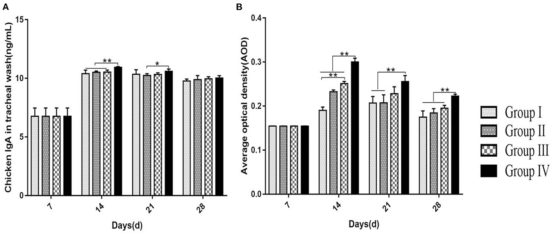 IBV-specific antibody levels in serum and IgA level in tracheal washes were detected using a commercial chicken IBV Ab ELISA kit (CG6845, USA TSZ Biological Trade Co., Ltd.) and IgA ELISA kit (SEKCN-0018-96T, Beijing Solarbio Science & Technology Co., Ltd.) according to the manufacturers' instructions. The detection range of the IBV Ab ELISA kit is from 2.5 to 180 ng/l, and the IgA ELISA kit is from 94 to 6,000 pg/ml with a sensitivity of 18 pg/ml. Samples were added to antigen-coated 96-well microplates and incubated for 1 h at room temperature. The antibody was added to each well and incubated for 1 h at room temperature. Further, streptavidin–HRP and substrate solution were added to the wells. Then, the reaction was stopped and the optical density was determined at 450 nm. The corresponding concentration was calculated using a standard curve.