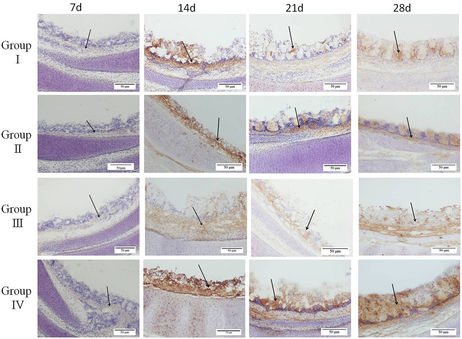 The level of IgA+ cells on the mucosal surface of the trachea was determined by IHC. At day 7, IgA+ cells on the mucosal surface of the trachea were few and mainly distributed in the mucosa lamina propria of the trachea. From day 14 to 28, most of the IgA+ cells were distributed in the lamina propria and upper layer of the trachea mucosa with a few IgA+ cells in the submucosa (Figure 3). The number of IgA+ cells increased gradually and reached a maximum level at day 14 in groups II, III, and IV. The number of IgA+ cells in group IV was higher (p < 0.01) compared with the number in other groups at day 14. In addition, group III showed higher (p < 0.01) level of IgA+ cells at day 14 compared with the level in group I. The number of IgA+ cells in groups II, III, and IV showed a slight decrease from day 21 to 28. The number of IgA+ cells in group I was highest at day 21, and being decreased till day 28. At day 21 and 28, the number of IgA+ cells was higher (p < 0.01) in group IV compared with other groups (Figure 2B).