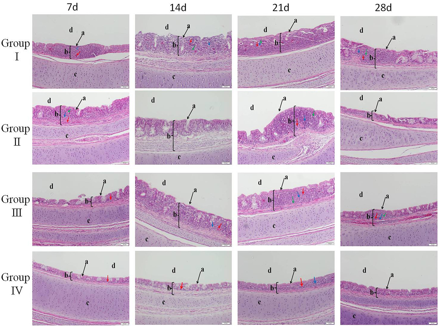 HE staining to delineate the relieving effect of SGDL granule combined with doxycycline on IBV-induced trachea histopathogic changes (magnification, ×200). Group I served as a control. Broilers in Group II were given doxycycline whereas Group III was given SGDL granule through drinking water. Broilers in Group IV were given SGDL granule and doxycycline in drinking water. It was intraocularly and intranasally challenged by IBV at day 28. a indicates cilia; b indicates trachea mucosa; c indicates trachea cartilage; and d indicates trachea lumen. Red arrow: congestion; blue arrow: lymphoid cell; green arrow: mononuclear cell. SGDL, Shegandilong; HE, hematoxylin–eosin.