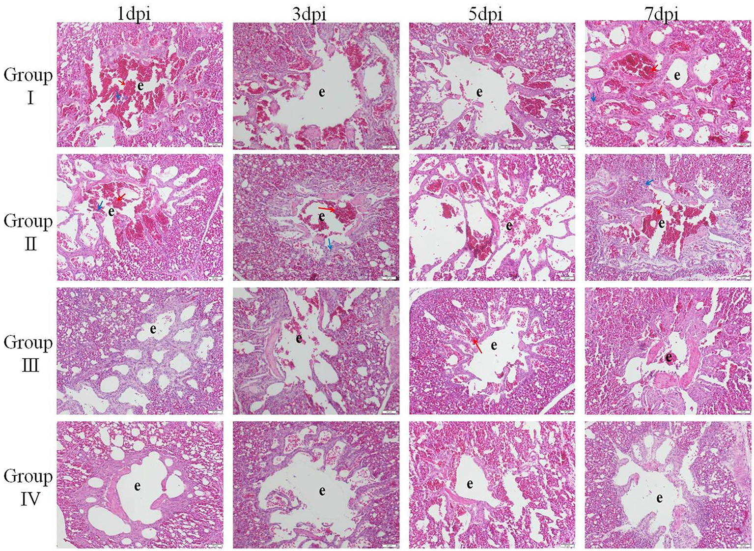 Lungs of chicks in group I showed severe hemorrhages in the parabroncheal lumen and vascular lumen at day 1 post-infection. In addition, chicks in this group showed small amounts of monocyte and lymphocyte infiltration in the alveolar space at day 5 post-infection. At day 7 post-infection, chicks in group II showed hemorrhages in parabroncheal lumen, and chicks in group III showed slight monocytes and lymphocytes infiltration. Interestingly, chicks in group IV did not show significant pathological changes, as shown in Figure 5.