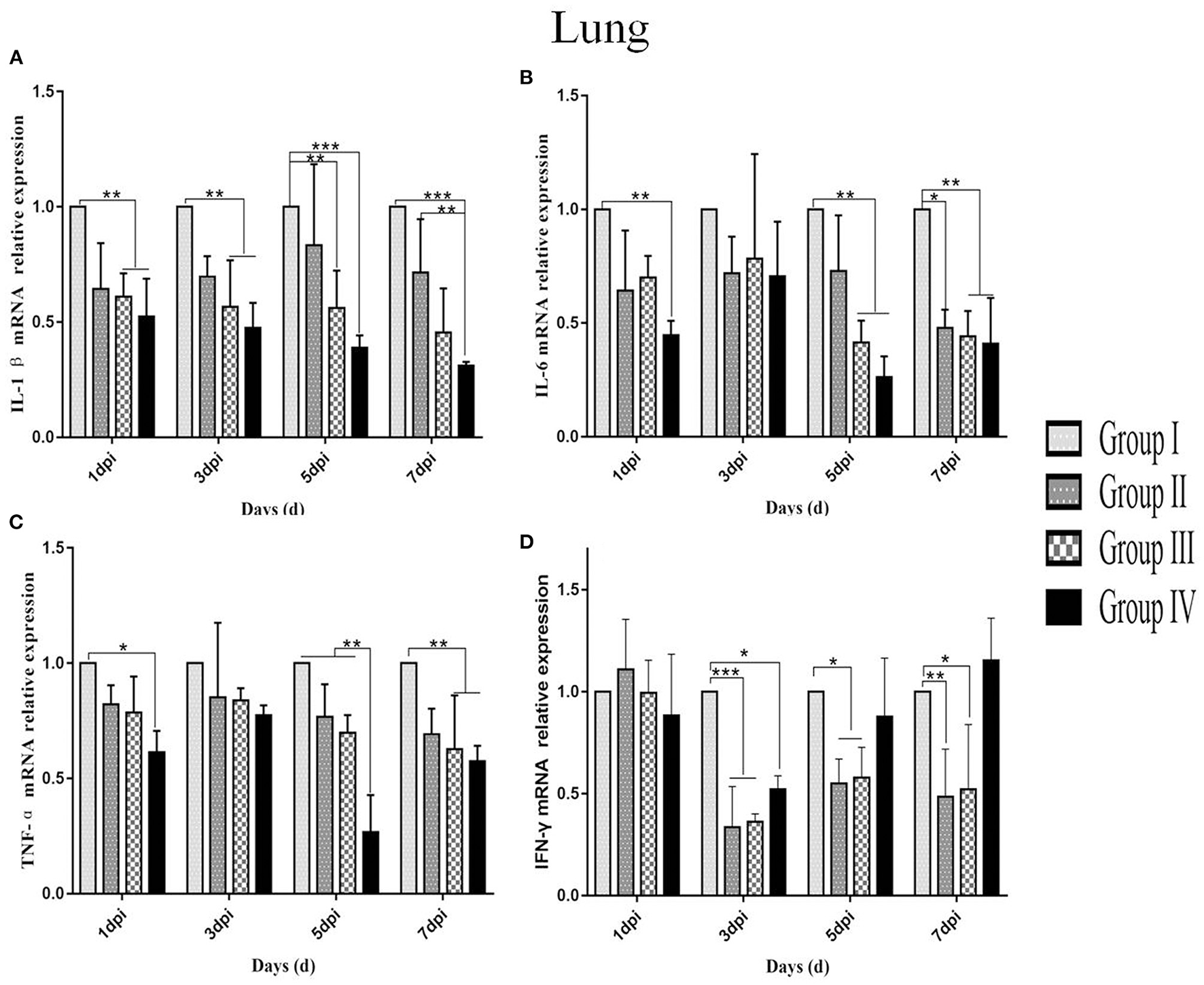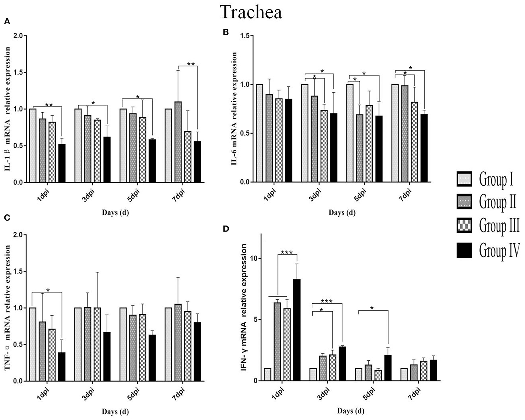 The IFN-γ mRNA expression in the trachea of group IV was higher compared with the expression levels in groups I, II, and III from day 1 to 7 post-infection. The IFN-γ mRNA expression in group IV was different (p < 0.01) compared with the expression levels in groups I, II, and III at day 1 post-infection. At day 3 post-infection, the IFN-γ mRNA expressions in group IV (p < 0.01) and group III (p < 0.05) were different compared with the expression level in group I. The IFN-γ mRNA expression in group IV was different (p < 0.05) compared with the expression level in group I at day 5 post-infection. There is no difference (p > 0.05) in all groups at day 7 post-infection (Figure 7D). In the lung, the IFN-γ mRNA expressions in the other three groups were lower than that in group I and the IFN-γ mRNA expression in group IV was higher than those of groups II and III at days 3, 5, and 7 post-infection. The IFN-γ mRNA expressions in group IV (p < 0.05) and groups III and II (p < 0.01) were different compared with the expression level in group I at day 3 post-infection. The IFN-γ mRNA expressions in groups II and III (p < 0.05) were different compared with the expression level in group I at day 5 post-infection. The IFN-γ mRNA expressions in groups II (p < 0.01) and III (p < 0.05) were significantly different compared with the expression level in group I at day 7 post-infection. There is no difference (p > 0.05) in all groups at day 1 post-infection (Figure 8D).
