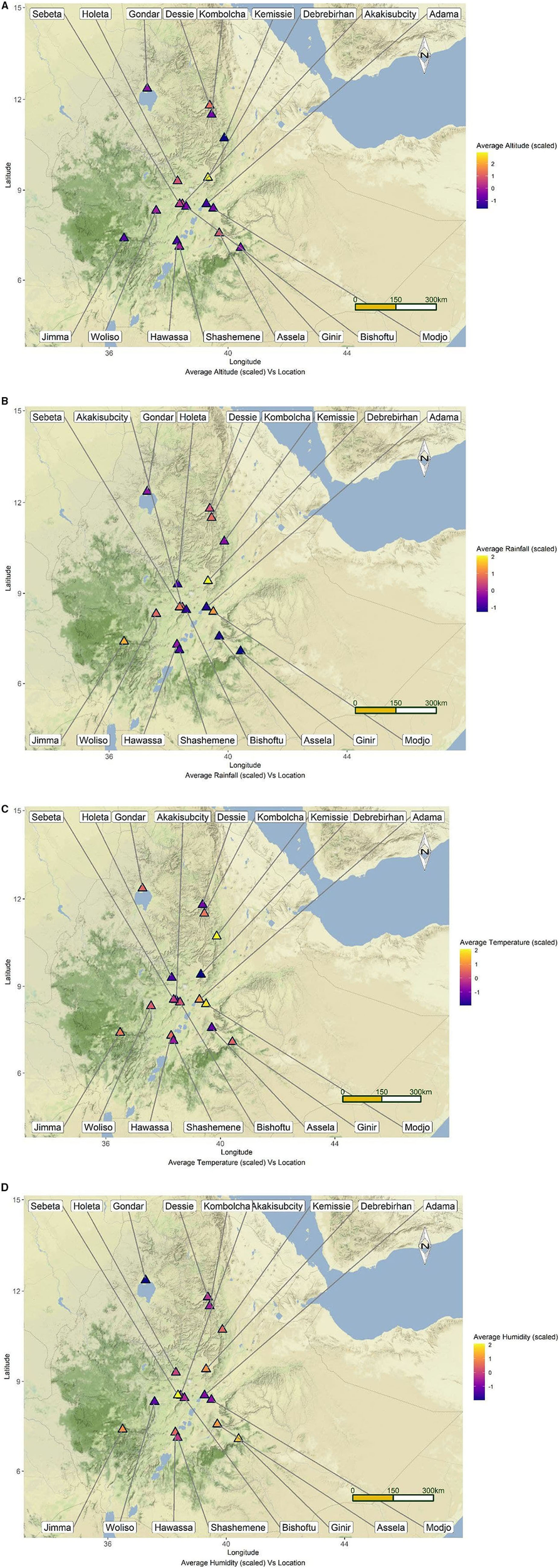 Map of Ethiopia depicting the locations of the study towns along with their mean altitude (A), rainfall (B), temperature (C), and humidity (D).