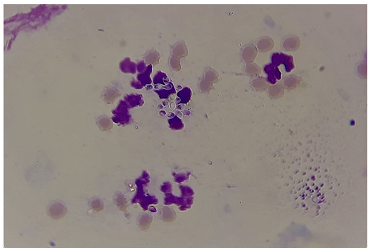Results of microscopic examination of morphological appearance of the yeast form of Histoplasma capsulatum variety farciminosum (arrows).