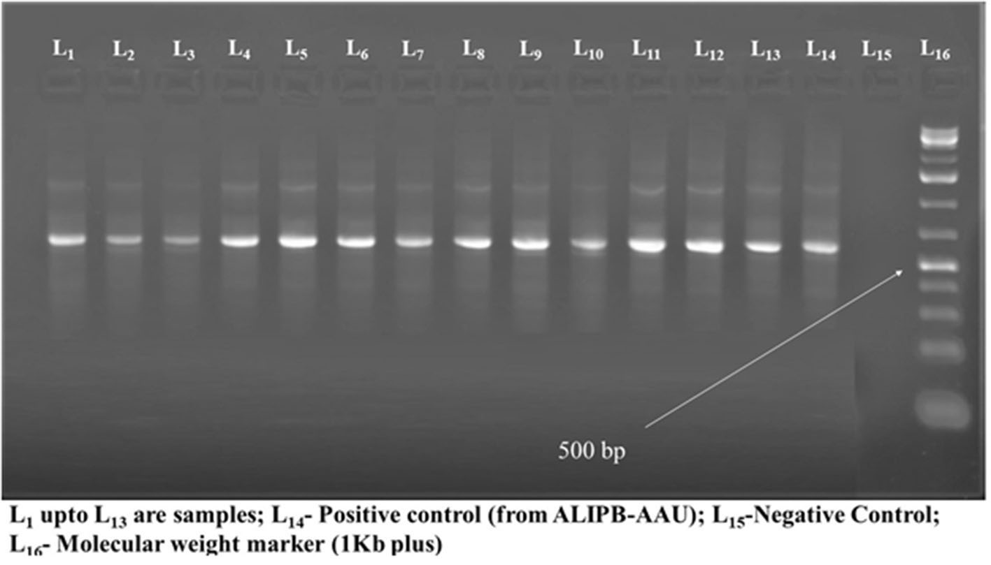 A nested PCR amplifying about 514 bp of DNA was used as described by Jiang et al. (12) and Scantlebury et al. (13) using primers designated P3, 2R8, F5, and 2R5 supplied by Eurofins Genetics, Germany. DNA of H. capsulatum var. farciminosum reference strain CBS 539.84 was used as positive control whereas extracts of Saccharomyces cerevisiae DNA were used as negative control. Each PCR reaction mixture contained 50 ng/mL of template DNA and 10 pmol of PCR primers P3 and 2R8 added to BioMix red (Bioline Reagents Limited, UK) in a 25 mL reaction volume, as follows: 12 mL BioMix red, 2 mL forward primer, and 2 mL reverse primer, 8 mL water, and 1 mL of DNA template (50 ng/μL). The first round of PCR was run using the P3 (forward primer: 50-CGGAAGGATCATTACCACGCCG-30) and 2R8 (reverse primer: 50-CAGCGGGTATCCCTACCTGATC-30) in the thermal cycler (Eppendorf Master cycler) with denaturation at 94°C for 10 mins followed by 35 cycles of the succeeding steps of denaturation at 94°C for 1 min, annealing at 49°C for 1 min and extension at 72°C for 1 min and a final extension period of 72°C of 7 mins. A 1-in-10 (v/v) dilution of the product from the first reaction was added to fresh master mix and amplified using forward primer: F5 (50-CTACCCGGCCACCCTTGTCTAC-30) and reverse primer: 2R5 (50- CCTACCTGATCCAGTCAACC-30). The reaction cycles for the second round of PCR were the same as the first round, except that the annealing temperature was raised to 55°C for 1 min. The PCR products were visualized by gel electrophoresis using 2% agarose (Sigma Chemical Co, St. Louis, MO) dissolved in Tris-borate-EDTA buffer (0.1 M Tris, 0.09 M boric acid, and 0.001 M EDTA [pH 8.4]), allowing it to solidify and finally staining with ethidium bromide (3 mL per 100 mL agarose). The electrophoresis was conducted at 90 V for 50 mins by mixing 5 mL of each PCR product with l mL of loading dye in each well. The bands were visualized with a UV transilluminator.