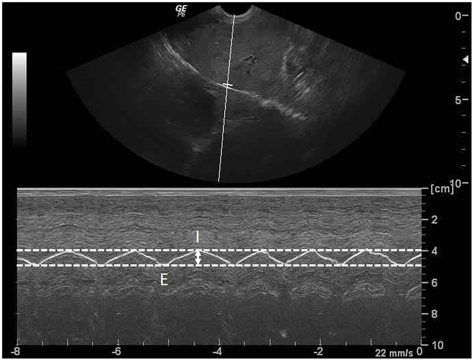 Sagittal ultrasonographic image of the diaphragm with motion (M)-mode display showed the measurement method for diaphragmatic excursion (DE; arrow). DE is the different distance of diaphragm between the peak inspiration (I) and the peak expiration (E).