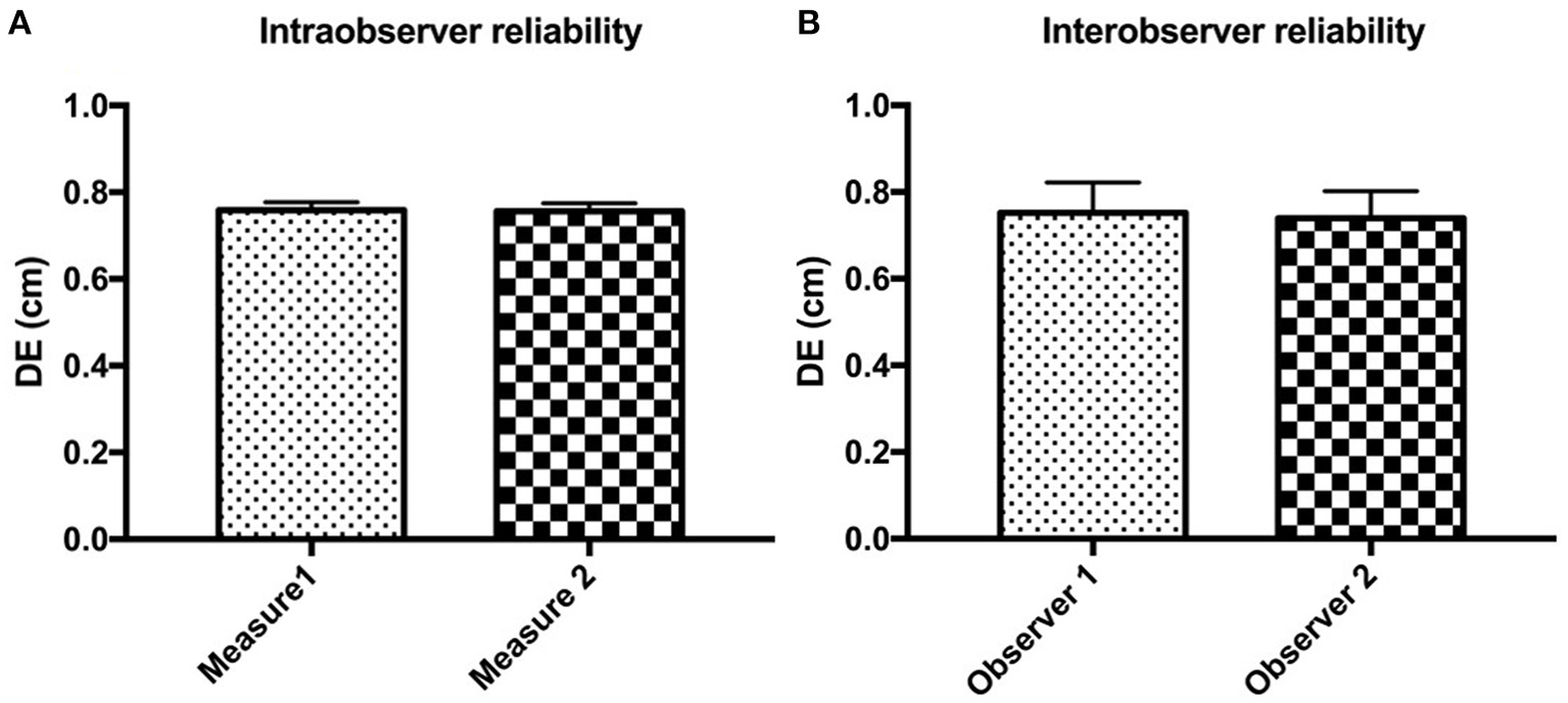 All data were analyzed using Prism7 (GraphPad Software, CA). The normality of each data set was analyzed using the Shapiro-Wilk test. All clinical data from normal dogs were described as descriptive data expressed as means ± standard error of the mean, including median, range (minimum-maximum), and 95% confidence intervals (CI). The DEs among postures were analyzed by one-way analysis of variance (ANOVA; normal distribution) or Kruskal Wallis test (non-normal distribution), depending on the data distribution. The relationship and the associations between DE (right and left), BW, and sex were assessed using Pearson's correlation analysis. Intra-class correlation coefficient and Bland-Altman plotting were calculated for the assessment of intra- and inter-rater reliability and reported as mean ± standard deviation. All statistical analyses were significant at P < 0.05.