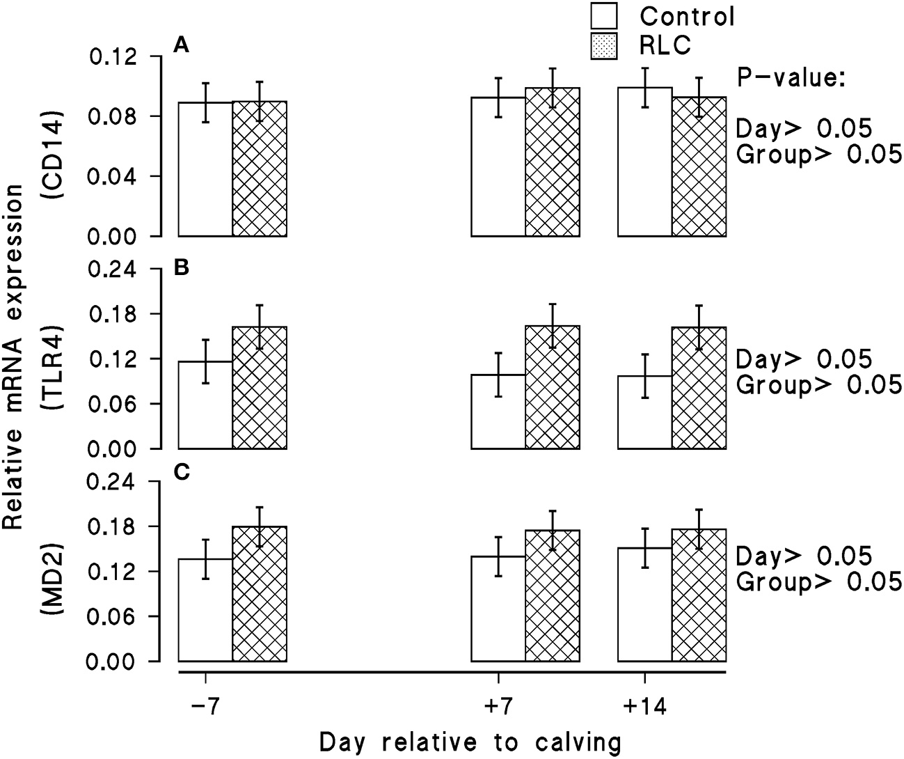 Previous works have clearly pinpointed the state of immune dysregulation in dairy cows during the transition period (12, 13). The presence of any metabolic imbalancing resulted from aberrant nutrient metabolism, causing metabolic stress and inflammatory responses in the early lactating cows (1). Higher concentrations of NEFA and BHB may influence early lactation disease and alter immune competence (14, 15). Pathological levels of both NEFA and BHB have been negatively associated with polymorphonuclear leukocytes and peripheral blood mononuclear cell functionality (16–18). In particular, increasing levels of NEFA during the periparturient period manipulate the inflammatory response of dairy cows via its impact on Toll-like receptors (TLR) and their signaling pathways (19). TLR are among the pathogen recognition receptors within the immune system. Toll-like receptors 4 (TLR4) are able to recognize lipopolysaccharides (LPS), i.e., endotoxins of gram-negative bacteria, which are located in various cell types (20). Cluster of differentiation 14 (CD14) are accessory proteins, which facilitate the interaction between LPS and TLR4. Subsequently, CD14 transfers LPS to myeloid differential protein 2 (MD2), a protein complexed with TLR4 on the cell surface, which initiates the myeloid differentiation factor 88 pathway and in turn transcription of the inflammatory cytokines.