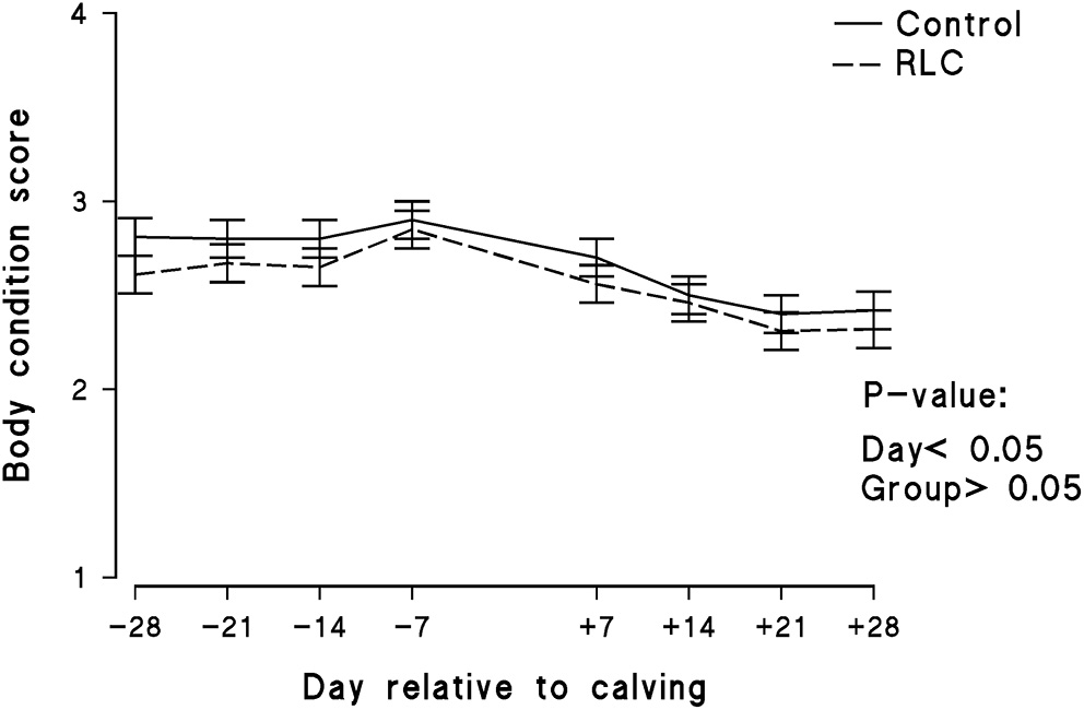 Data obtained weekly were statistically analyzed using the Proc Mixed procedure of SAS (44) for a completely randomized design with repeated measures. The model included the effects of group, day relative to calving, and the interaction between group and day. Days relative to calving was used as a repeated measurement, with cow within experimental groups as the subject. Daily DMI of the groups was analyzed as previously described (45); however, the interaction between group and day was taken out from the model. A gamma-type function model (Y = a*EXP – cd) was generated to describe the relation between daily milk production (Y) and time (d), while (c) is the slope. Data of milk fatty acid composition were analyzed using a completely randomized design. Data of gene expression were analyzed in JMP® 4.0 (SAS Institute, Cary, NC, USA) using the analysis of variance method (ANOVA) by least-square fit. Differences were considered significant at p < 0.05, whereas tendency was determined at 0.05 < p < 0.1. Data are expressed as the mean ± SEM.