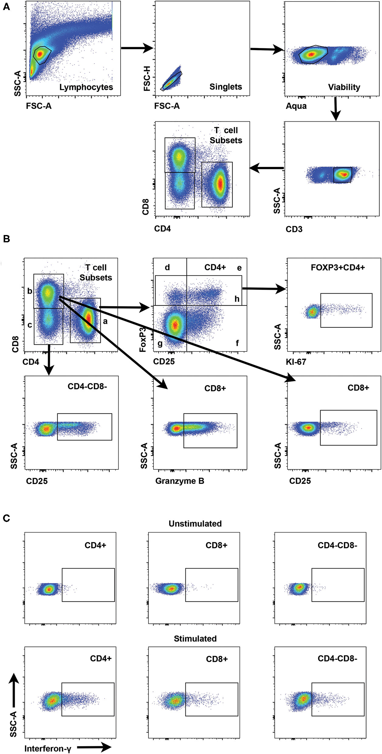 Gating strategies for interrogation of canine T cell subsets by flow cytometry. (A) Representative scatter plots reveal the gating strategy for detection of CD4+, CD8+, and CD4-CD8- T cell subsets starting with establishment of a lymphocyte gate, followed by gating on singlets, exclusion of dead cells by a viability stain and gating on CD3+ cells as the parental gate for T cell subsets. (B) Scatter plots showing interrogation of CD4+ T cells are representative for gating of specific populations for all T cell subsets. Regulatory CD4+ T cells include FoxP3+ (h) and CD25+FoxP3+ (e). CD25+FoxP3- cells (f) represent an activated T cell subset and CD25-FoxP3- cells (g) are designated as a quiescent T cell subset. Interrogation of FoxP3+ cells for Ki67 reveals the gating strategy for Ki67+ cells for all subsets. Gating strategies for CD25 and Granzyme B are shown for both CD4-CD8- and CD8+ T cells. (C) Representative scatter plots show interferon-γ staining and gating for CD4+, CD8+ and CD4-CD8- T cell subsets with or without stimulation with Con-A.