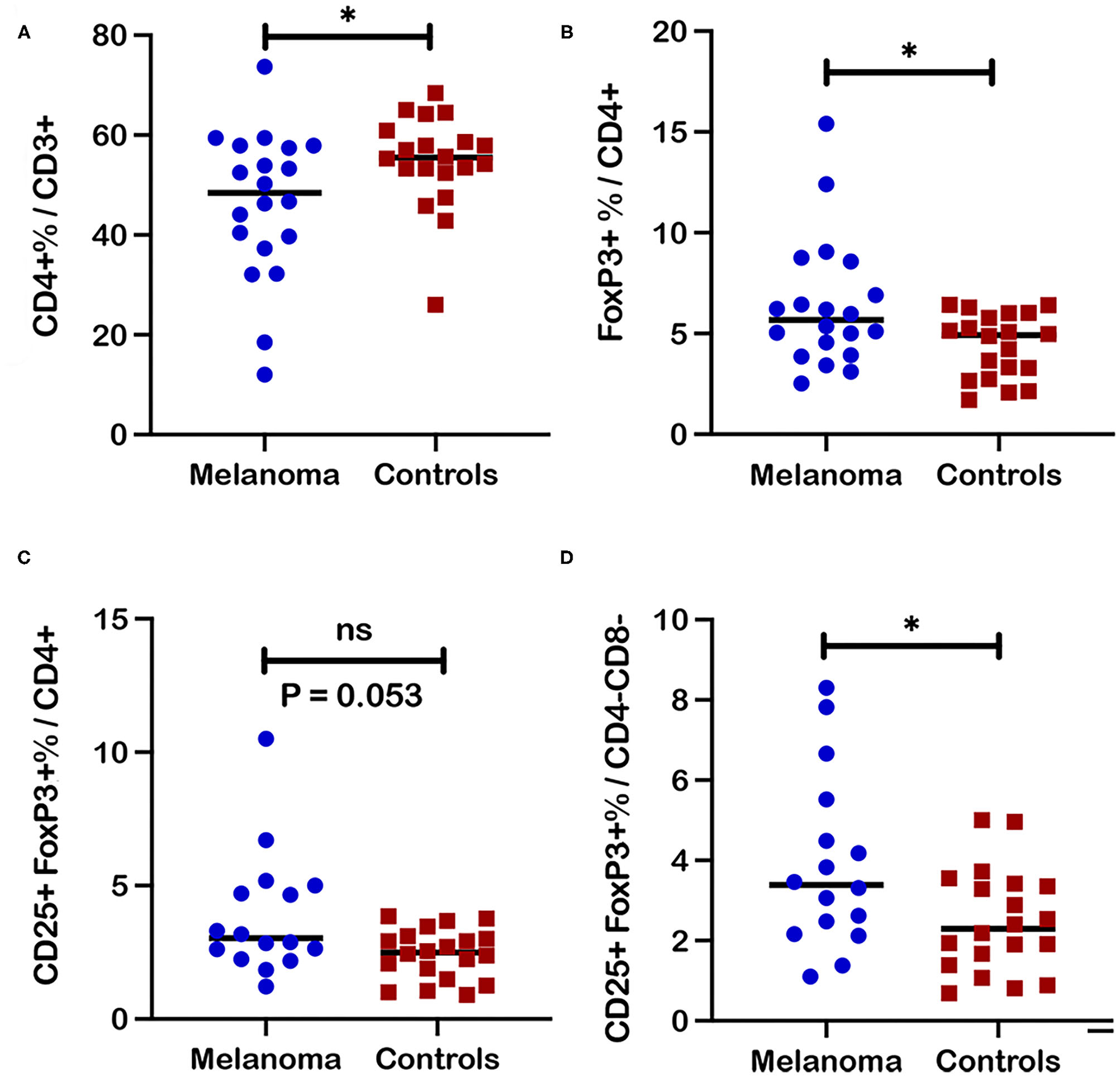 Frequencies of regulatory T cell subsets in blood from canine melanoma patients and healthy controls. (A) A comparison of median frequencies for CD4+ cells within the T cell population for patients and controls is shown. (B) Median frequencies of FoxP3+ and (C) CD25+FoxP3+ cells within the CD4+ T cell population are also compared between patients and healthy controls. (D) Median frequencies of CD25+FoxP3+ cells within the CD4-CD8- T cell population are compared between patients and healthy controls. Pair-wise analysis between patients and controls was conducted with the Mann Whitney test using GraphPad Prism software and two-tailed analysis. “ns” denotes not significant. A single asterisk (*) denotes a P-value < 0.05. P-values < 0.05 are considered significant.