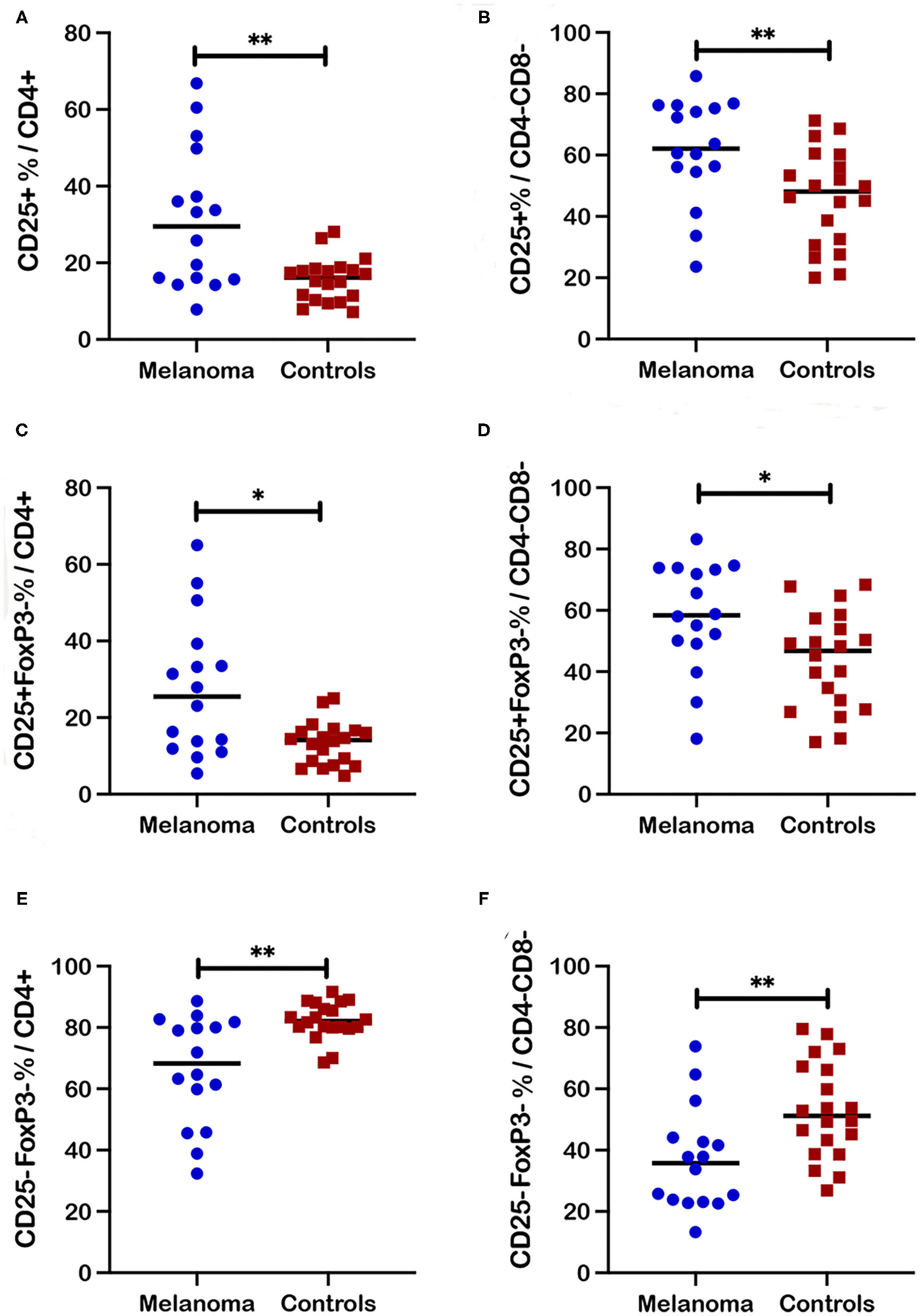 Frequencies of activated and quiescent T cell subsets in blood from canine melanoma patients and healthy controls. Median frequencies of CD25+ cells within the CD4+ (A) and CD4-CD8- (B) T cell subsets are compared between patients and healthy controls. Frequencies of CD25+FoxP3- cells within the CD4+ (C) and CD4-CD8- (D) T cell subsets are compared between patients and healthy controls. Median frequencies of CD25-FoxP3- cells within the CD4+ (E) and the CD4-CD8- (F) T cell subsets are compared between patients and healthy controls. Pair-wise analysis between patients and controls was conducted with the Mann Whitney test using GraphPad Prism software and two-tailed analysis. A single asterisk (*) denotes a P-value < 0.05 and two asterisks (**) denote a P-value < 0.01. P-values < 0.05 are considered significant.