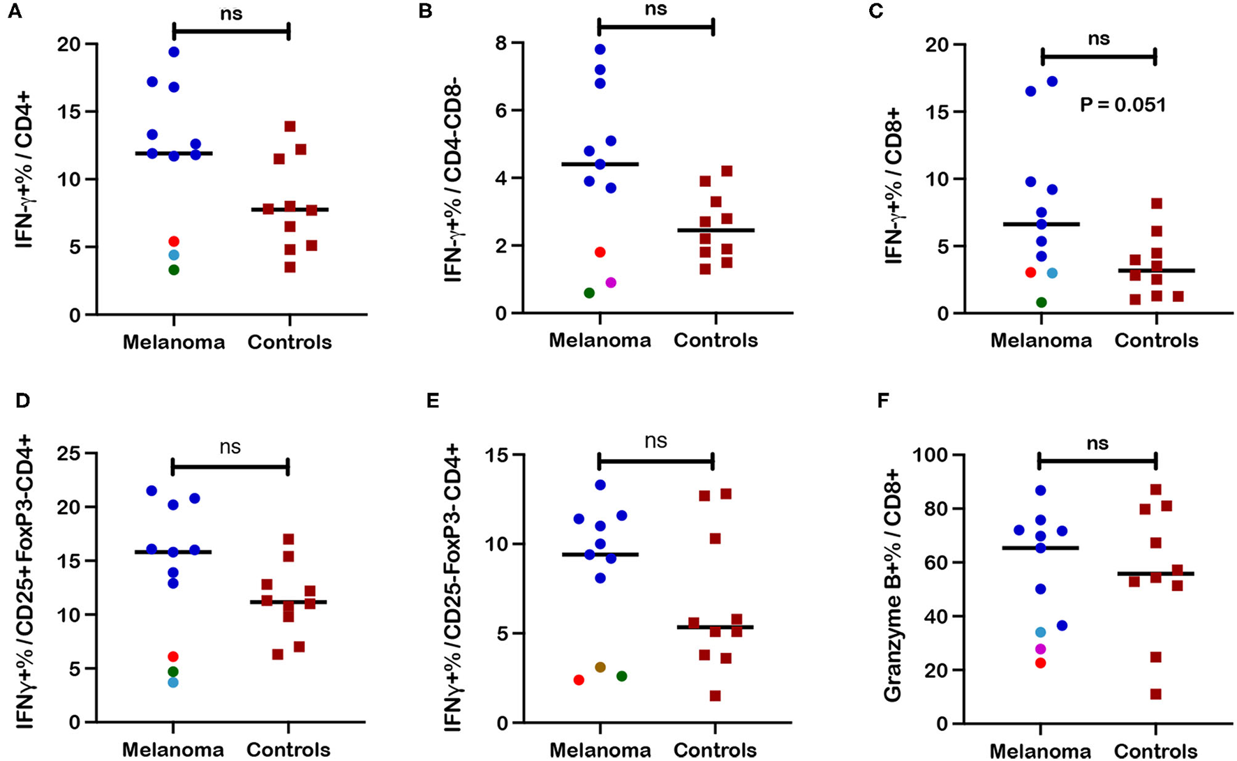Frequencies of interferon-γ+ (IFN-γ) and granzyme-B+ T cell subsets after ConA stimulation in blood from canine melanoma patients and healthy controls. Median frequencies of IFN-γ+ cells after ConA stimulation were determined in (A) CD4+, (B) CD4-CD8-, and (C) CD8+ T cells by intracellular cytokine staining (ICS) and flow cytometry and compared between patients and healthy controls. Median frequencies of INF-γ+ cells after ConA stimulation are also shown for (D) CD25+FoxP3- (activated) and (E) CD25-FoxP3- (quiescent) CD4+ T cells and compared between patients and controls. (F) Induction of granzyme B after ConA stimulation is represented by median frequencies of granzyme B+ cells within the CD8+ T cell subset and compared between patients and controls. Colored dots represent outlier patients with green indicating subject P10, red indicating subject P11, purple indicating subject P12, turquoise indicating subject P14, and brown representing P15. Values described for IFN-γ+ frequencies reflect values for stimulated cells after subtraction of values for unstimulated cells. Values described for granzyme B+ frequencies do not reflect subtraction of values for unstimulated cells. Pair-wise analysis between patients and controls was conducted with the Mann Whitney test using GraphPad Prism software and two-tailed analysis. “ns” denotes not significant.