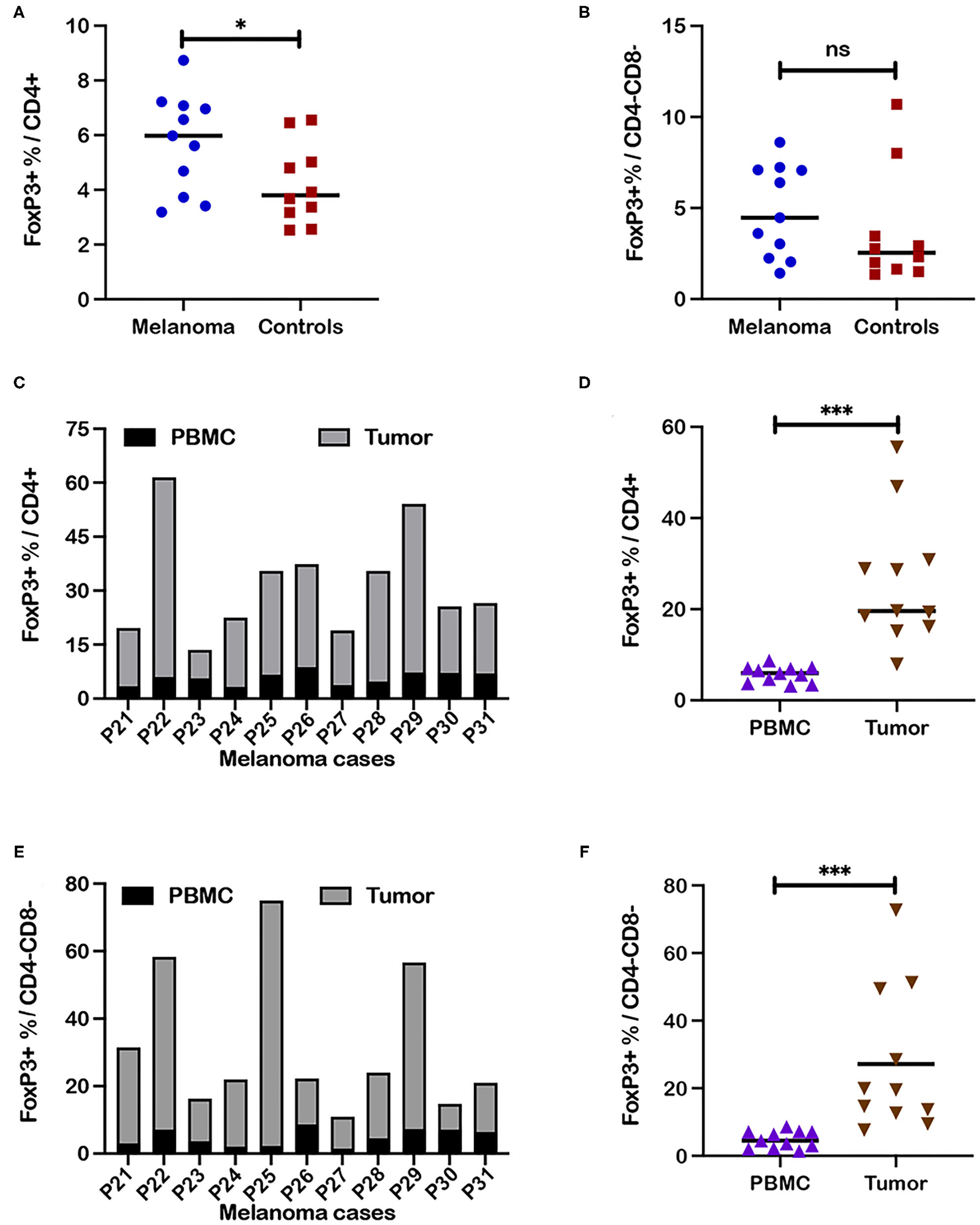 Comparison of frequencies of regulatory T cell subsets in tumor associated cells and blood in canine melanoma patients. PBMC isolated from blood and tumor associated cells from a separate cohort of 11 canine melanoma patients were assessed for T cell phenotypes by flow cytometry. (A) Median frequencies of FoxP3+ within CD4+ and (B) CD4-CD8- T cell populations in blood were compared between patients of this patient cohort and healthy controls. (C) Each stacked bar reflects frequencies of FoxP3+ cells within the CD4+ T cell subset in blood vs. tumor associated cells for a single patient. A comparison of frequencies assessed for blood and tumor associated cells is shown for all patients. (D) Median frequencies of FoxP3+ cells within the CD4+ T cell subset are compared between PBMC and tumor as a grouped analysis for the same patients. (E) A stacked bar analysis of frequencies of FoxP3+ cells within the CD4-CD8- T cell subset in blood vs. tumor associated cells from each patient is shown for all patients. (F) Median frequencies of FoxP3+ cells within the CD4-CD8- T cell subset are compared between PBMC and tumor as a grouped analysis for the same patients. Pair-wise analysis between frequencies for patients and controls was conducted with the Mann Whitney test and between PBMC and tumor associated cells using the Wilcoxon matched-pairs signed rank test, using GraphPad Prism software and a two-tailed analysis. “ns” denotes not significant. A single asterisk (*) denotes a P-value < 0.05; three asterisks (***) denote a P-value < 0.001. P-values < 0.05 are considered significant.