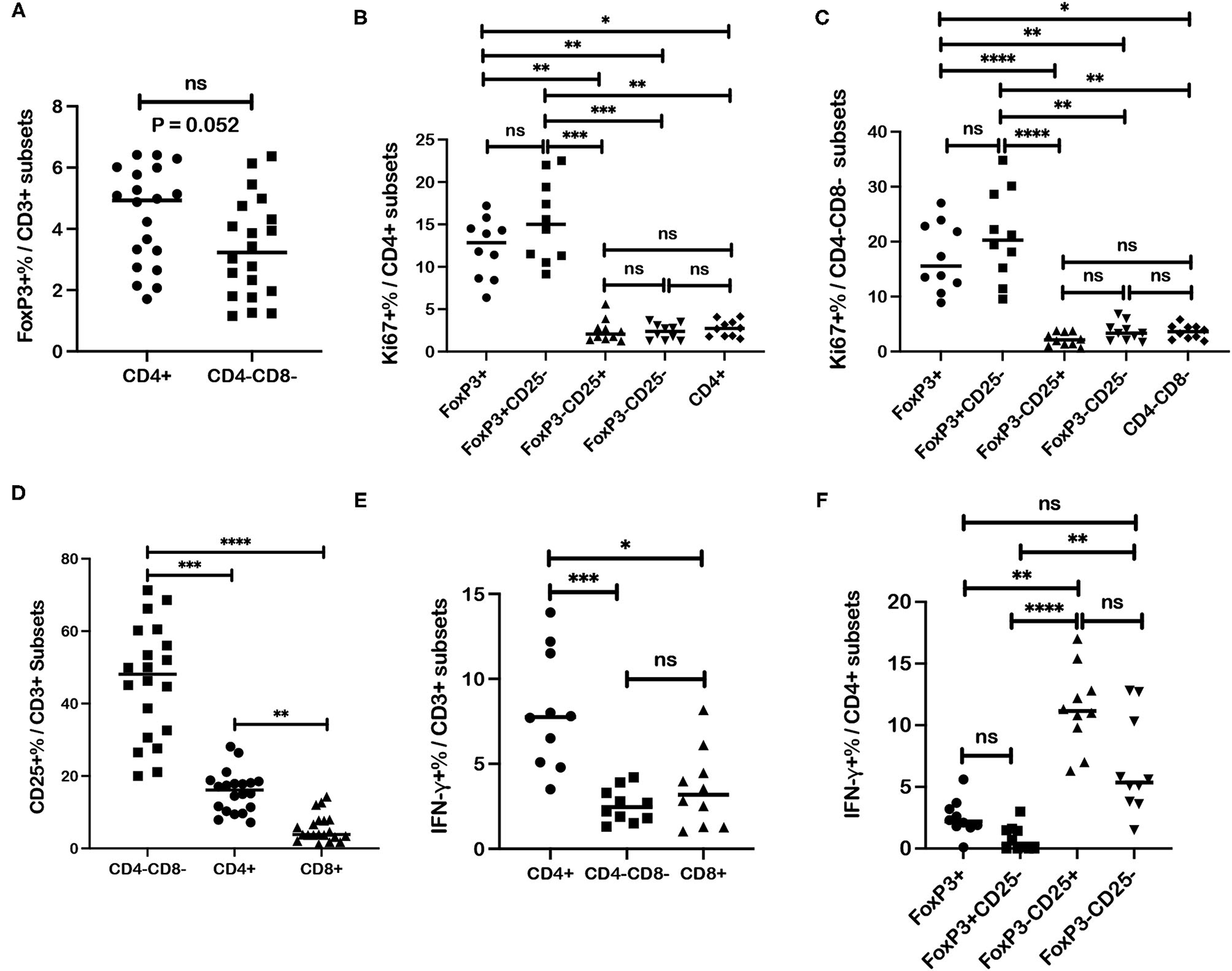 Associations between regulatory and activation markers for specific T cell subsets in healthy dog PBMC. (A) Median frequencies of FoxP3+ cells are compared between CD4+ and CD4-CD8- T cell subsets. (B) Median frequencies of Ki67+ cells within different subsets of CD4+ T cells including regulatory (FoxP3+; CD25-FoxP3+), activated (CD25+FoxP3-) and quiescent (CD25-FoxP3-) populations, are compared. (C) Median frequencies of Ki67+ cells within different subsets of CD4-CD8- T cells including regulatory (FoxP3+), activated (CD25+FoxP3-) and quiescent (CD25-FoxP3-) populations, are compared. (D) CD4+, CD4-CD8-, and CD8+ T cells subsets are compared for median frequencies of CD25+ cells. (E) Median frequencies of interferon-γ (IFN-γ)+ cells after ConA stimulation were compared between CD4+, CD4-CD8-, and CD8+ T cells subsets. (F) Median frequencies of IFN-γ+ cells after ConA stimulation were compared between different CD4+ T cell subsets including regulatory (FoxP3+; CD25-FoxP3+), activated (CD25+FoxP3-) and quiescent (CD25-FoxP3-) populations. Values described for IFN-γ+ frequencies reflect values for stimulated cells after subtraction of values for unstimulated cells. Comparisons of frequencies between three more subsets were performed with a Kruskal-Wallis test with Dunn's post-hoc test for multiple comparisons. Pair-wise analysis between frequencies of two subsets (A) was conducted with the Mann Whitney test and two-tailed analysis. All analyses used GraphPad Prism software. “ns” denotes not significant. A single asterisk (*) denotes a P-value < 0.05; two asterisks (**) denote a P-value < 0.01; three asterisks (***) denote a P-value < 0.001 and four asterisks (****) denote a P-value < 0.0001. P-values < 0.05 are considered significant.