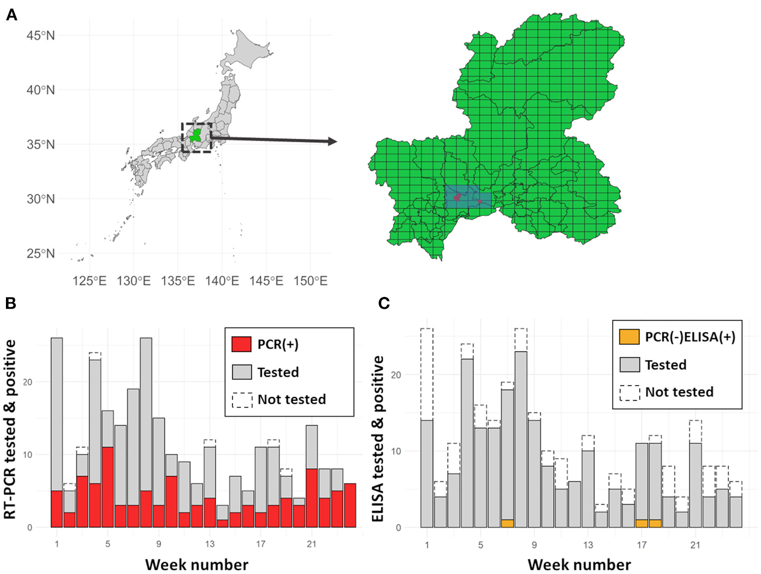 (A) The location of Gifu Prefecture in Japan and sampling meshes. Gifu prefecture (green) is located in central Japan. In the expanded figure, red dots denote the locations where PCR(+) wild boar were found before 25th September 2018. All the selected meshes (blue, 11 meshes) were included in the intensive surveillance area. (B) Number of wild boar tested weekly by RT-PCR vs. those who tested positive. The red and grey bars denote PCR(+) and PCR(–) wild boar in the investigated 24 weeks, respectively. The area framed with dashed lines shows the number of hunted but not tested individuals. (C) Number of wild boar tested weekly by ELISA vs. those who tested positive. The orange bar (at the bottom of week 7, 17, and 18) denotes ELISA-positive PCR-negative wild boar. The grey bar denotes ELISA-negative wild boar. As in the case of (B), the area framed with dashed lines shows the hunted but not tested individuals.