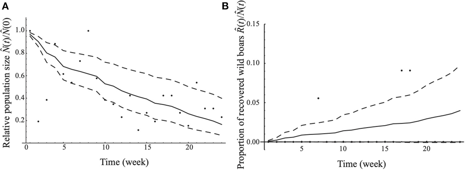 The model fitting with the data. The median estimated relative population size [in (A)] and the median estimated proportion of recovered wild boar [in (B)] are demonstrated as solid lines. The 95% confidence intervals are denoted by dashed lines. Each dot is the observed value of the relative population size [in (A)] and proportion of recovered wild boar [in (B)] in each week.