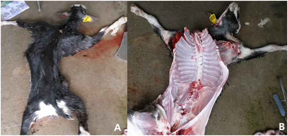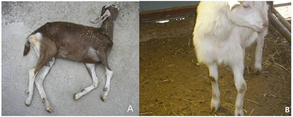 Clinical signs and lesions of CAEV-infected goats. The diseased goats showing clinical signs with encephalitis and arthritis of carpal joints. (A) Opisthotonus. (B) Swelling and abduction of carpal joints in adult goat.