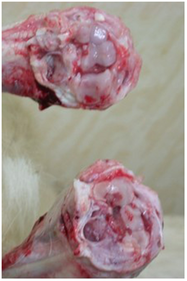 Pathological changes. Swelling and hardness of joint heads, articular cartilage ulceration, severely swollen mesenteric lymph nodes, and fibrinous arthritis were found.