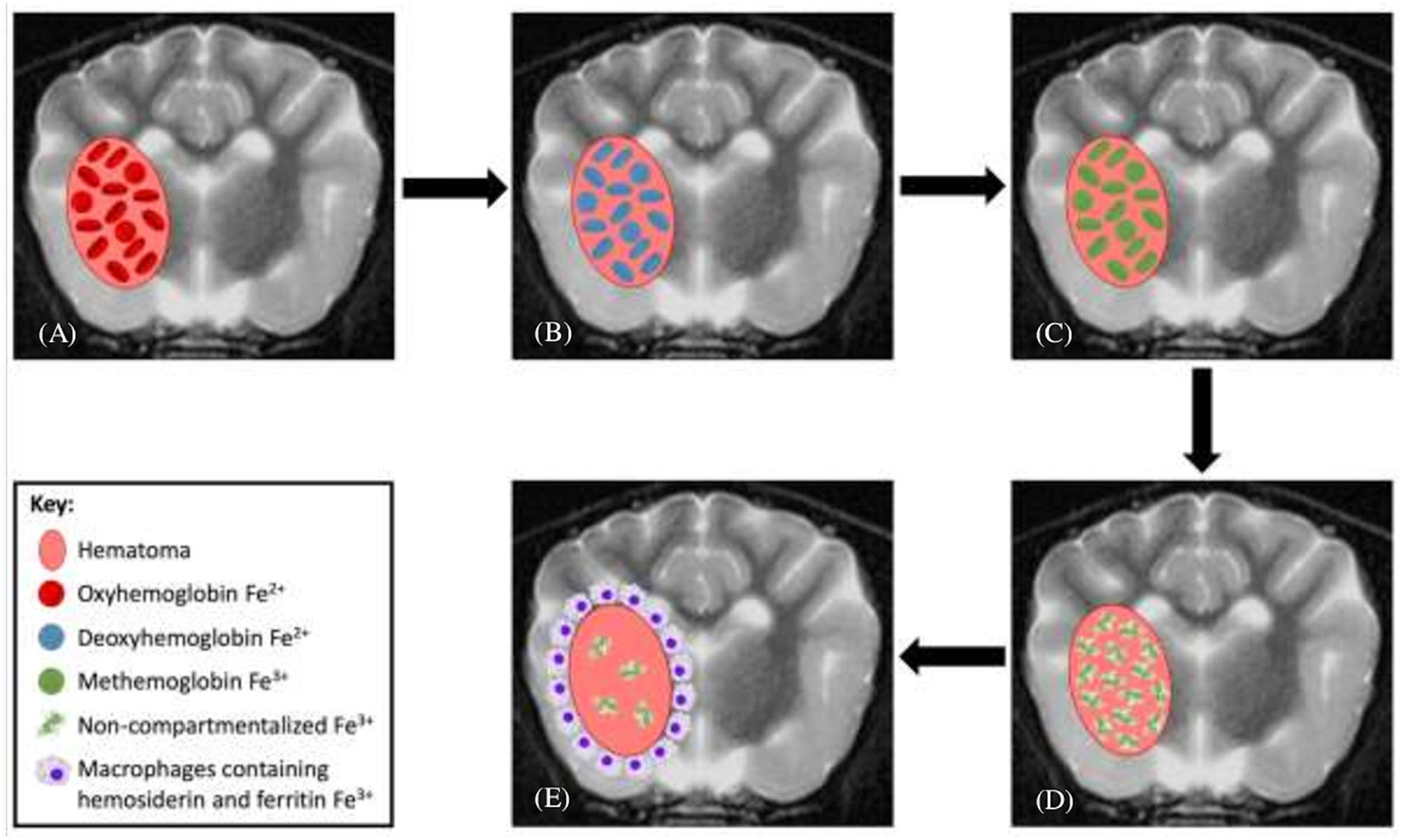 Evolution of intraparenchymal hemorrhage on magnetic resonance imaging. (A) In the earliest stage of acute hematomas, blood is still oxygenated within intact red blood cells (RBCs). (B) Rapid deoxygenation occurs, first at the periphery and then throughout the hematoma, but the RBCs remain intact. (C) As the lesion undergoes oxidation, the peripheral hemoglobin within intact RBCs forms methemoglobin. (D) This oxidation process and conversion to methemoglobin occur throughout the hematoma and subsequently the RBCs lyse. (E) As free methemoglobin is formed, hemosiderin and other iron storage forms are deposited within macrophages in the adjacent brain parenchyma. Eventually, the lesion contains no intact RBCs, and methemoglobin is resorbed or metabolized, leaving only a collapsed cleft lined by hemosiderin and ferritin without any notable central constituents.