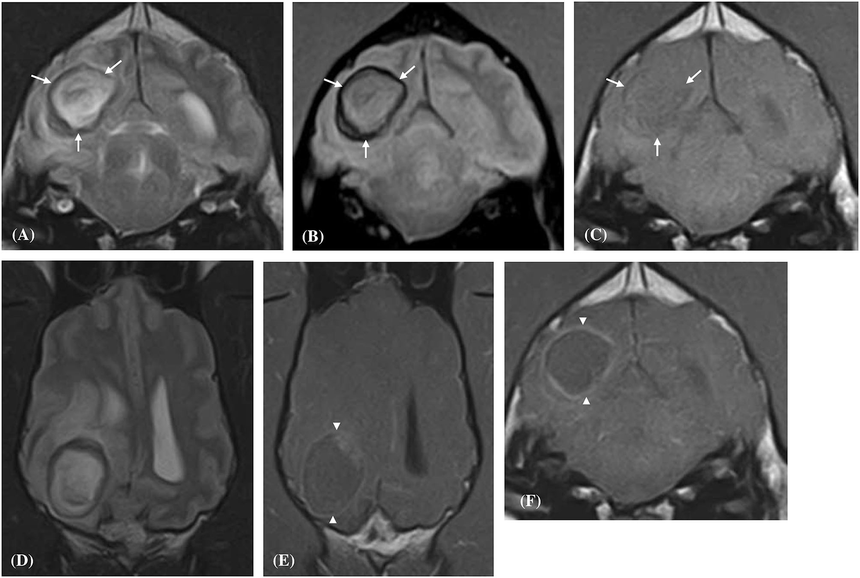 Transverse (A–C,F) and Dorsal (D,E) magnetic resonance images of a dog (Case 6) with a solitary well-defined intracranial intra-axial hematoma affecting the white matter of the right occipital lobe and associated perilesional oedema. The lesion displays a clear regional dichotomy with a hypointense thin, complete, circumferential peripheral border region (white arrows) and a large central predominately hyperintense region (relative to gray matter) on T2-weighted (A,D), T2* gradient-echo (B) images. On pre-contrast T1-weighted images the peripheral border region is again hypointense (C) but is thinner relative to the T2-weighted images. Following contrast administration, the hematoma displays a thin peripheral enhancement pattern (white arrow heads) with no enhancement of the central portions of the lesion (E,F).