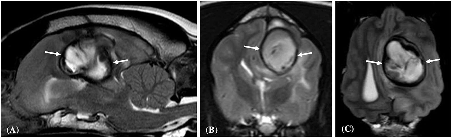 Left parasagittal (A), transverse (B), and dorsal (C) plane T2- weighted images of a dog (Case 8) with a large well-defined intracranial intra-axial hematoma affecting the white matter of the left parietal lobe. Note the circumferential nature of the thin hypointense rim (white arrows) in all three planes. Additionally, the lesion induces a marked mass effect resulting in transtentorial herniation, subfalcine herniation and compression of the left lateral ventricle.