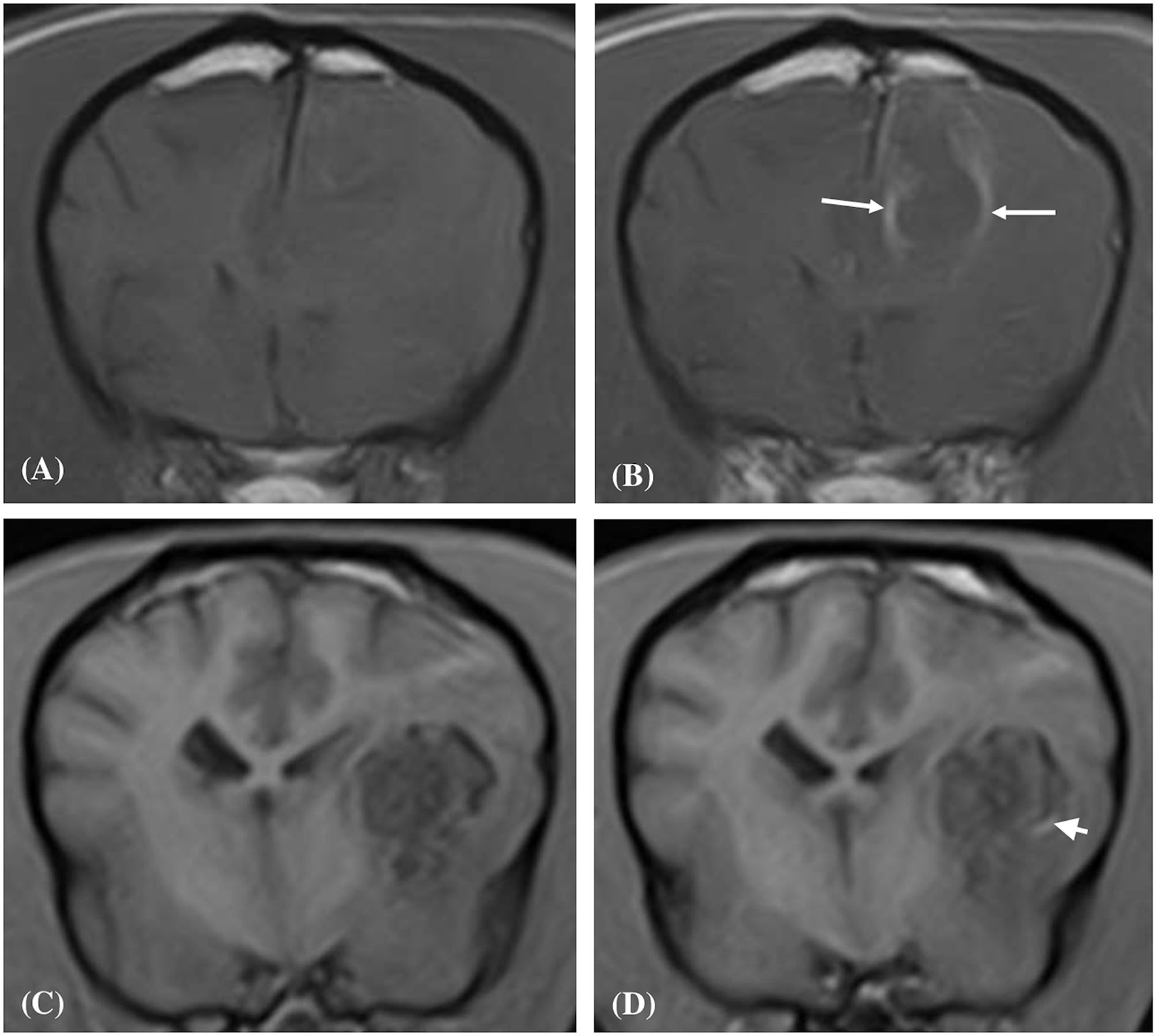 Transverse plane T1-weighted (A), and T1-weighted post contrast (B), images of a dog (Case 4) with an intracranial intra-axial hematoma affecting the white matter of the left fronto-parietal lobe. The lesion displays an obvious peripheral contrast enhancement pattern (long white arrows) (B). Transverse plane T1-weighted (C), and T1-weighted post contrast (D) images of dog (Case 1) with a hematoma lesion affecting the white matter of the medial aspect of the left temporo-frontal lobe and internal capsule. The lesion displays a faint and focal area of peripheral contrast enhancement (short white arrow). Neither lesions post contrast (B,D) show enhancement of their central regions.