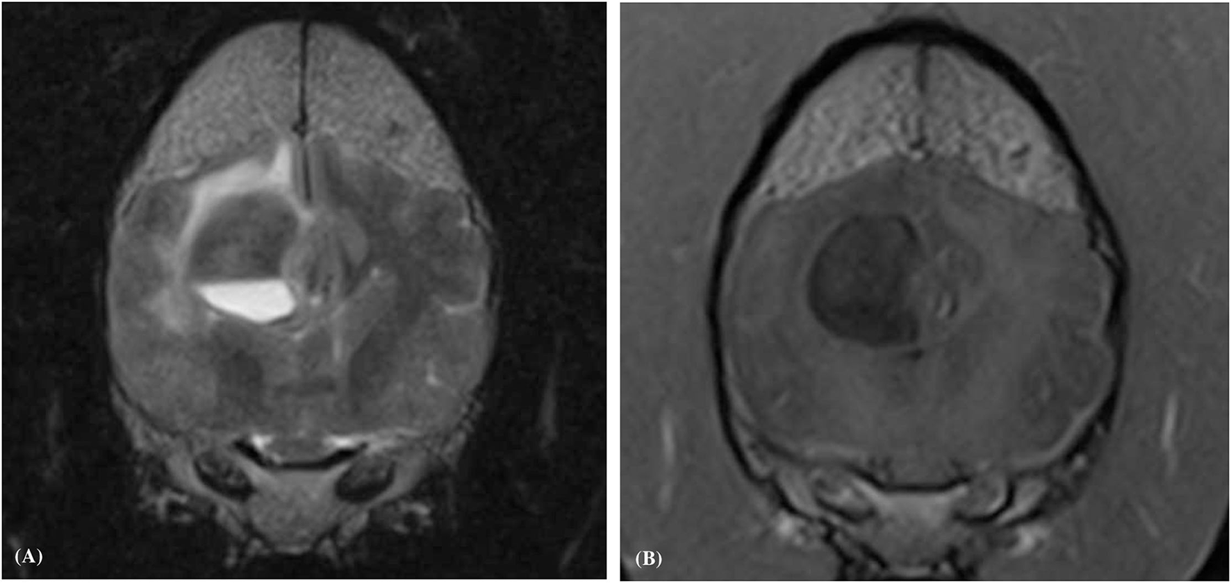 Histopathological confirmation of the diagnosis of a benign intra-axial hematoma was achieved in (2/10) of the patients. A diagnosis of a benign hematoma was made in (4/10) patients based on the results of a follow-up MRI study, which was also accompanied by neurological improvement. In the remaining four patients diagnosis was met by clinical follow-up alone, all these dogs were reported to have shown marked neurological improvement within 1 month after first presentation. On subsequent re-evaluations after 3 months all dogs were considered neurologically normal.