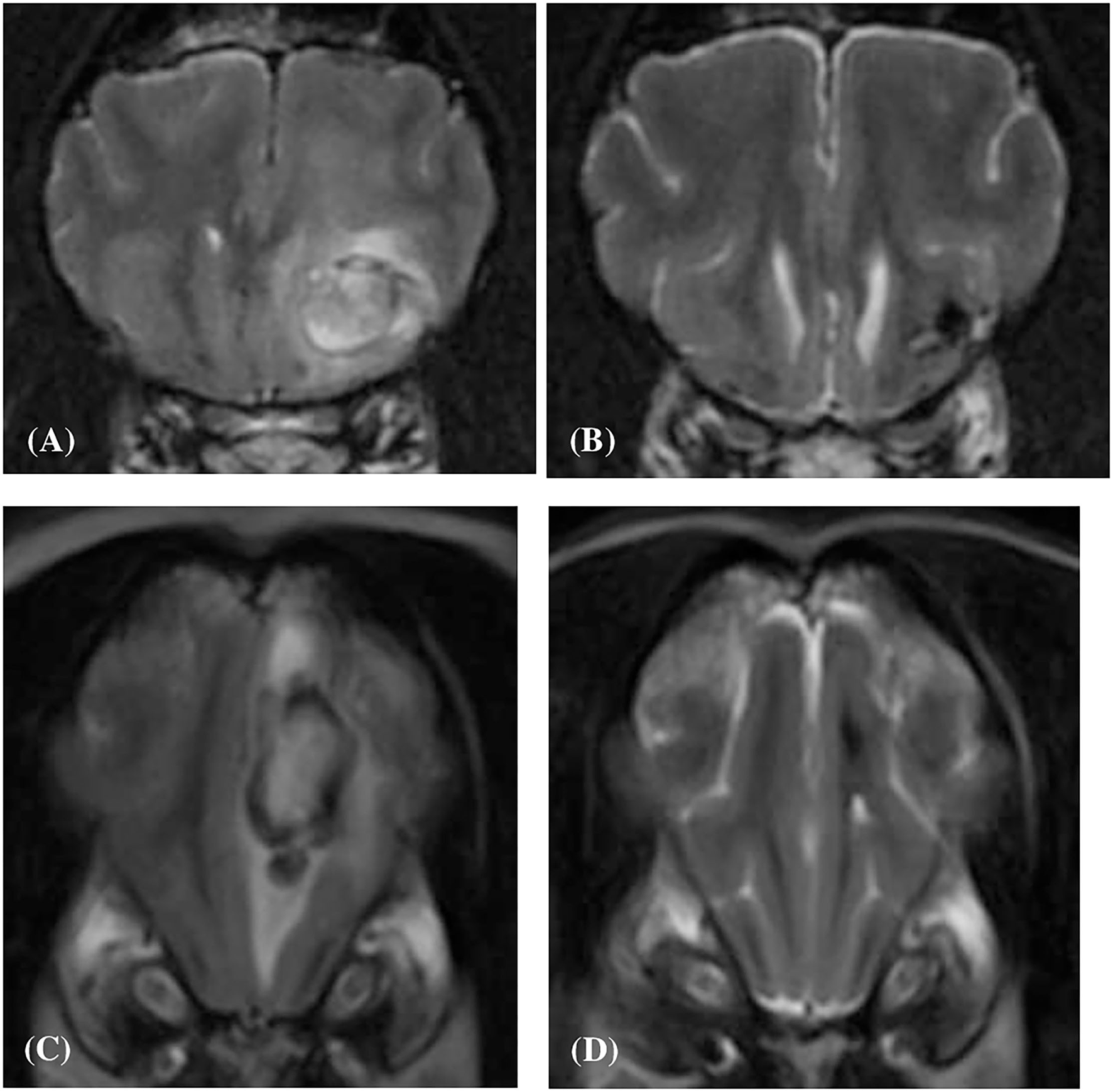Transverse T2-weighted image (A) of a dog (Case 10) with an intracranial intra-axial hematoma affecting white matter of the left frontal lobe at first presentation. Transverse T2-weighted image (B) of the same dog as displayed in (A) at the same location but 83 days later. Transverse T2-weighted image (C) of a dog (Case 2) with an intracranial intra-axial hematoma affecting the white matter of the left frontal lobe (centrum semiovale) at first presentation. Transverse T2-weighted image (D) of the same dog as displayed in (C) at the same location but 207 days later. In both the follow up images (B,D) the lesions have reduced dramatically in volume, are uniformly hypointense and perilesional oedema has resolved. This is illustrative of normal intra-axial intracranial hematoma contraction and maturation.