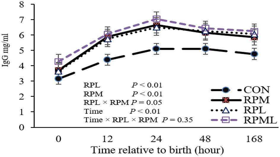Growth performance, colostrum quality and serum total protein data were analyzed considering the main effects of RPM, and RPL, and interaction RPM, RPL, using the following SAS model: