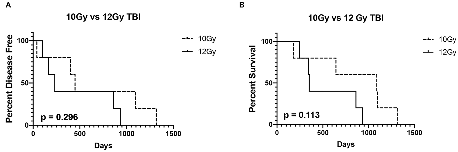 Disease-free interval (A) and overall survival (B) of 5 dogs treated with 10Gy total body irradiation (TBI) before autologous peripheral blood hematopoietic cell transplantation (autoPBHCT) and adoptive T-cell therapy (ACT) vs. 5 dogs treated with 12GY TBI before autoPBHCST and ACT. A p value of < 0.05 was considered statistically significant.