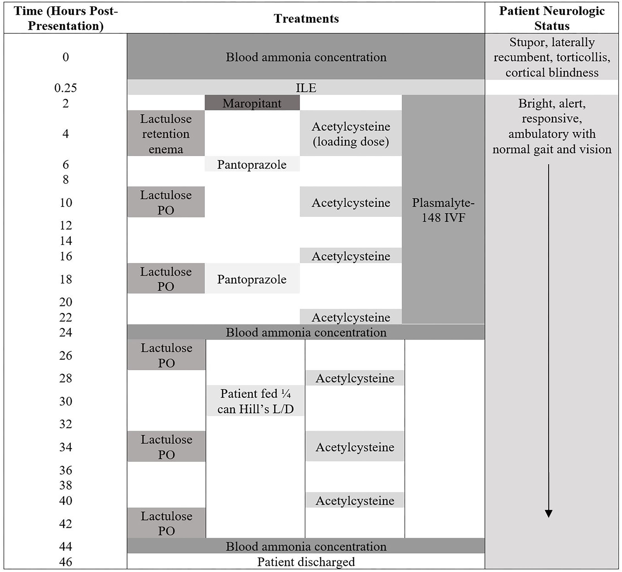 The patient was then admitted into the intensive care unit. At this time, the owners called to advise that they had located the missing naproxen tablets and that exposure was no longer a possibility. The following treatments were administered, listed in chronological order (Figure 1): maropitant (Cerenia Injectable Solution 10 mg/mL; Zoetis) at 1 mg/kg, IV, q 24 h, Plasmalyte-148 (Plasma-Lyte A 1,000 mL; Baxter Healthcare Corporation) at 60 mL/kg/day, N-Acetylcysteine (N-Acetylcysteine 200 mg/mL solution; Hospira Inc.) at 140 mg/kg, IV loading dose, once, then 70 mg/kg, IV, q 6 h, and pantoprazole (Pantoprazole 40 mg vial; West-Ward) at 1 mg/kg, IV, q 12 h. The patient received one lactulose (Lactulose solution 10 g/15 mL; Hi-Tech Pharmacal Co. Inc.) retention enema at 1.5 mL/kg diluted 1:3 with warm water following admission into ICU. Overnight the patient subsequently received two doses of lactulose at 0.25 mL/kg, PO, q 8 h.