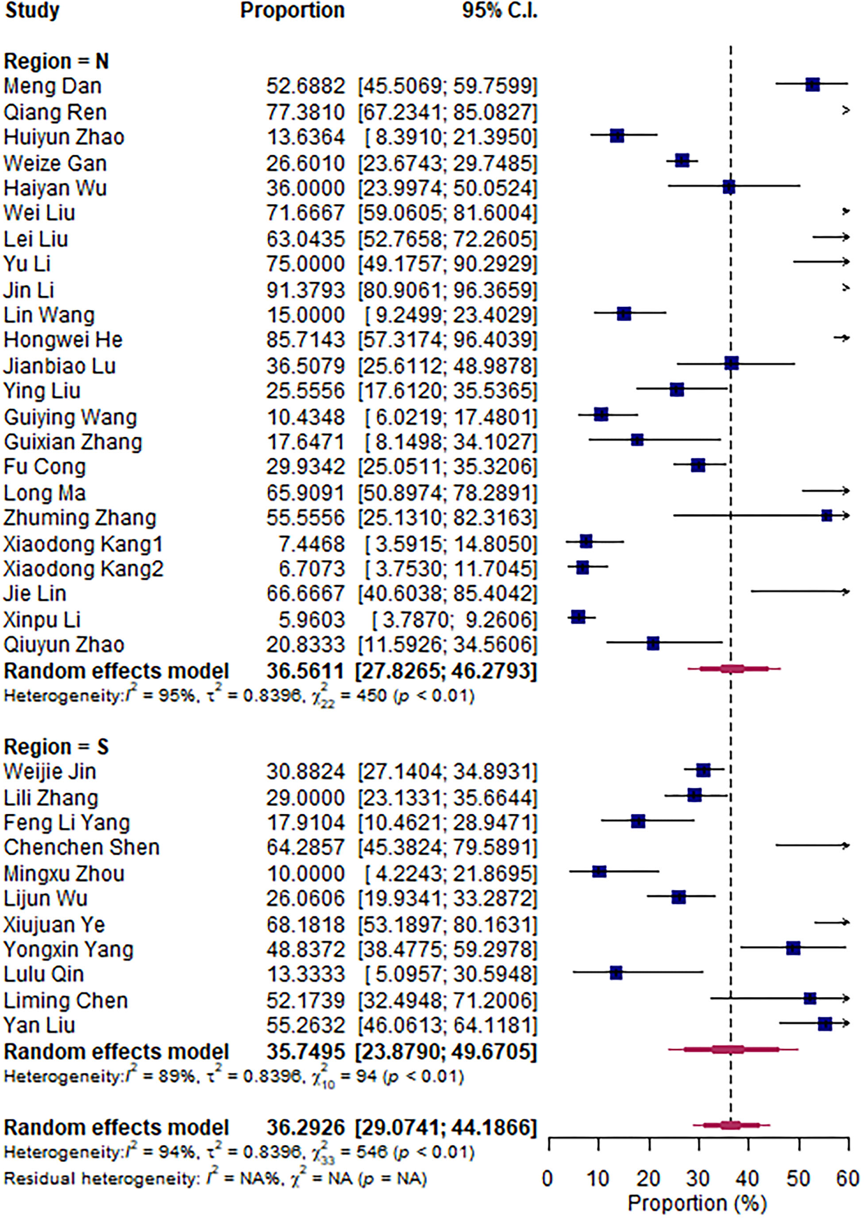 The pooled prevalence of S. aureus is 36.23% [95% confidence interval (CI): 29.31–43.76%]. An evident heterogeneity was observed (I2 = 94%, t2 = 0.7583, P < 0.01). Therefore, subgroup analysis was conducted to explore the sources of heterogeneity (Figure 2).