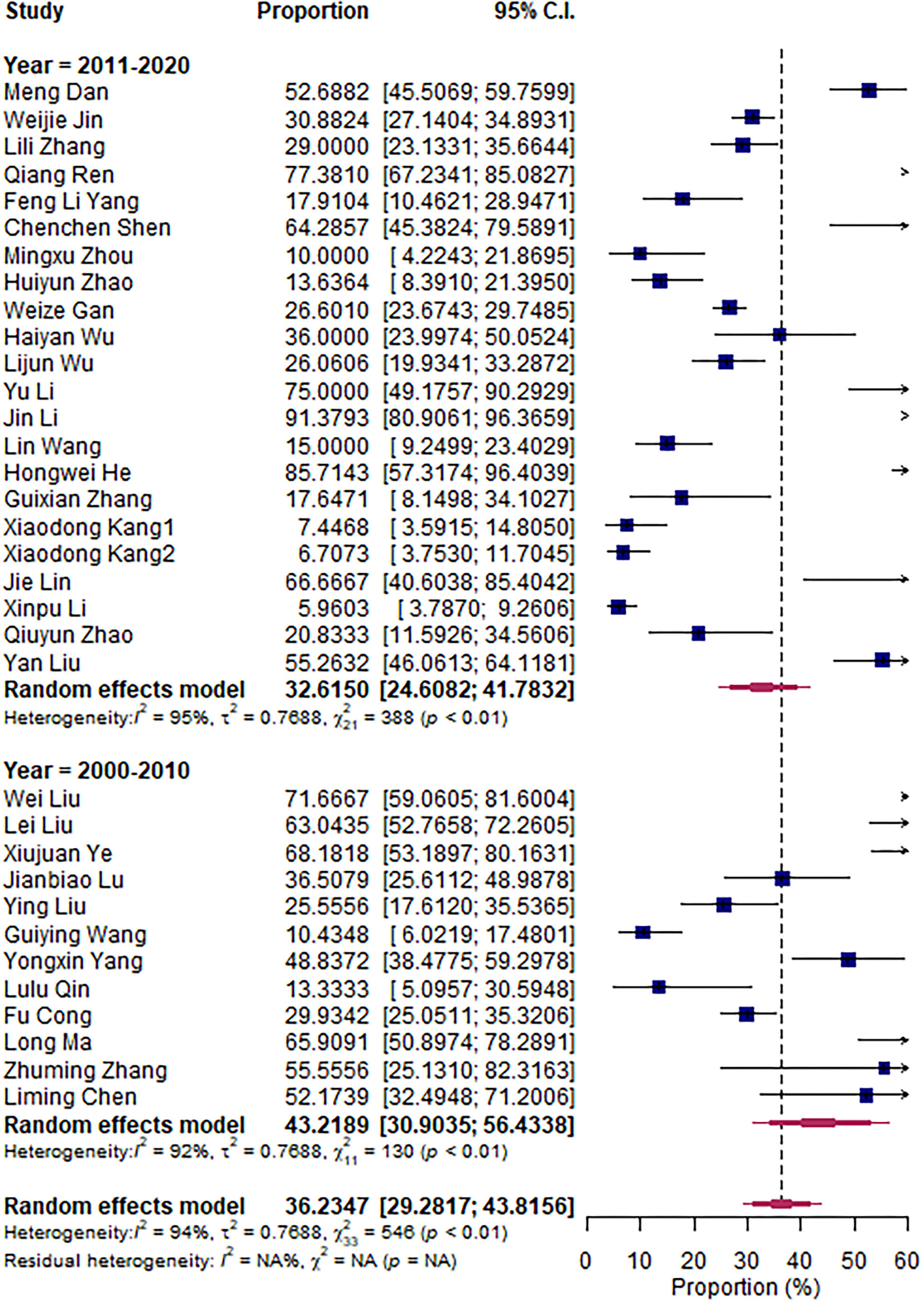 The research articles were divided into subgroups based on research period (2000–2010 vs. 2011–2020), sampling sites (North vs. South China), and mastitis grade (clinical vs. subclinical mastitis). The pooled subgroup prevalence of S. aureus was 36.56% and 35.75% in North and South China, respectively (Figure 3); 43.22 and 32.62% for the 2000–2010 period and the 2011–2020 period, respectively (Figure 4); and 35.62% and 38.79% in clinical and subclinical mastitis, respectively (Figure 5).