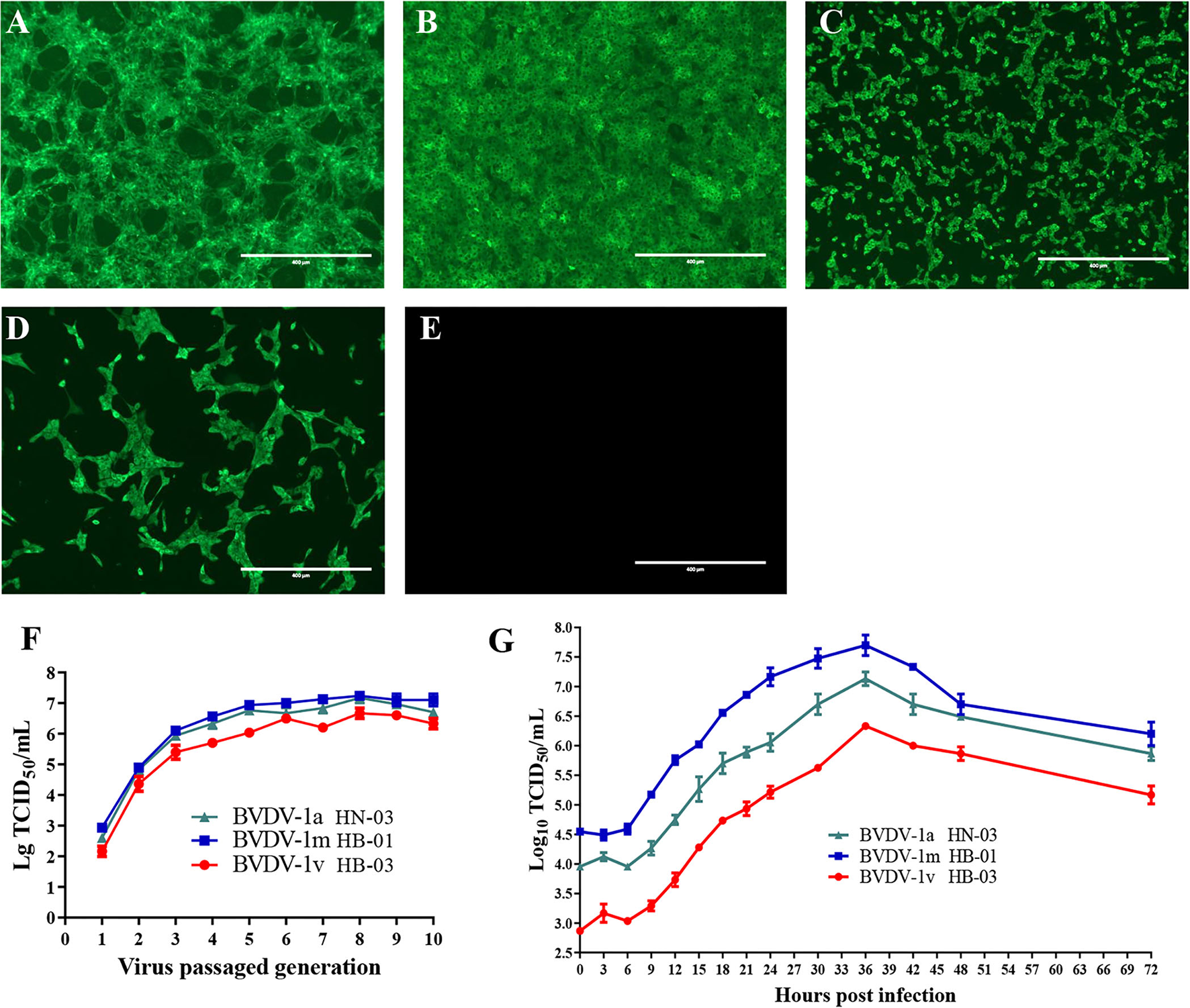 Viral isolation and characterization. The specific immunofluorescent signals were detected in the cytoplasm of cells inoculated with BVDV-1a HN-03 (A), BVDV-1m HB-01 (B), and BVDV-1v HB-03 (C). Madin-Darby bovine kidney (MDBK) cells inoculated with BVDV-1b AV-69 (as a positive control) cells showed specific fluorescence (D), and mock-infected cells showed no bright fluorescence (E). Median tissue culture infectious dose (TCID50) of the three bovine viral diarrhea virus (BVDV) isolates inoculated with MDBK in passages (F). One-step growth curves of BVDV-1a HN-03, BVDV-1m HB-01, and BVDV-1v HB-03 isolates (G).