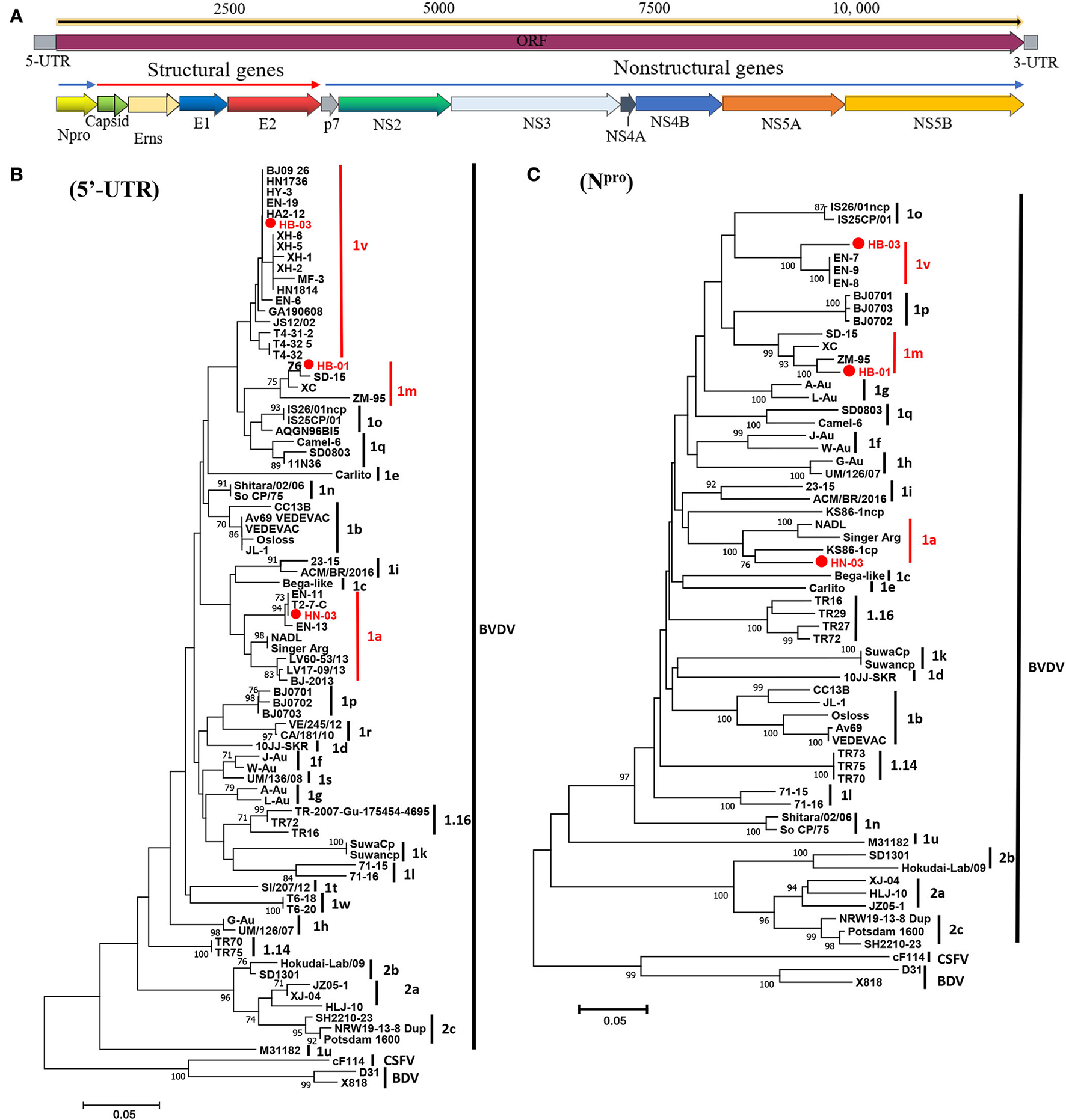 Schematic diagram of the genomic structure and phylogenetic analysis. Schematic diagram of the annotated bovine viral diarrhea virus (BVDV) genome (A). Phylogenetic tree of the nucleotide sequences of the 5-untranslated region (5′-UTR) (B) and Npro(C). Molecular evolutionary genetics analysis was performed with MEGA 7 (Molecular Evolutionary Genetics Analysis) using the neighbor-joining (NJ) and bootstrap analysis (n = 1,000) method. Unrooted trees described the relationship between sequences retrieved pestivirus [BVDV-1, BVDV-2, classical swine fever virus (CSFV), and border disease virus (BDV)] from the GenBank database and the three BVDV isolates analyzed in this work (red circle). Information on the reference strains is shown in Supplementary Table 3.
