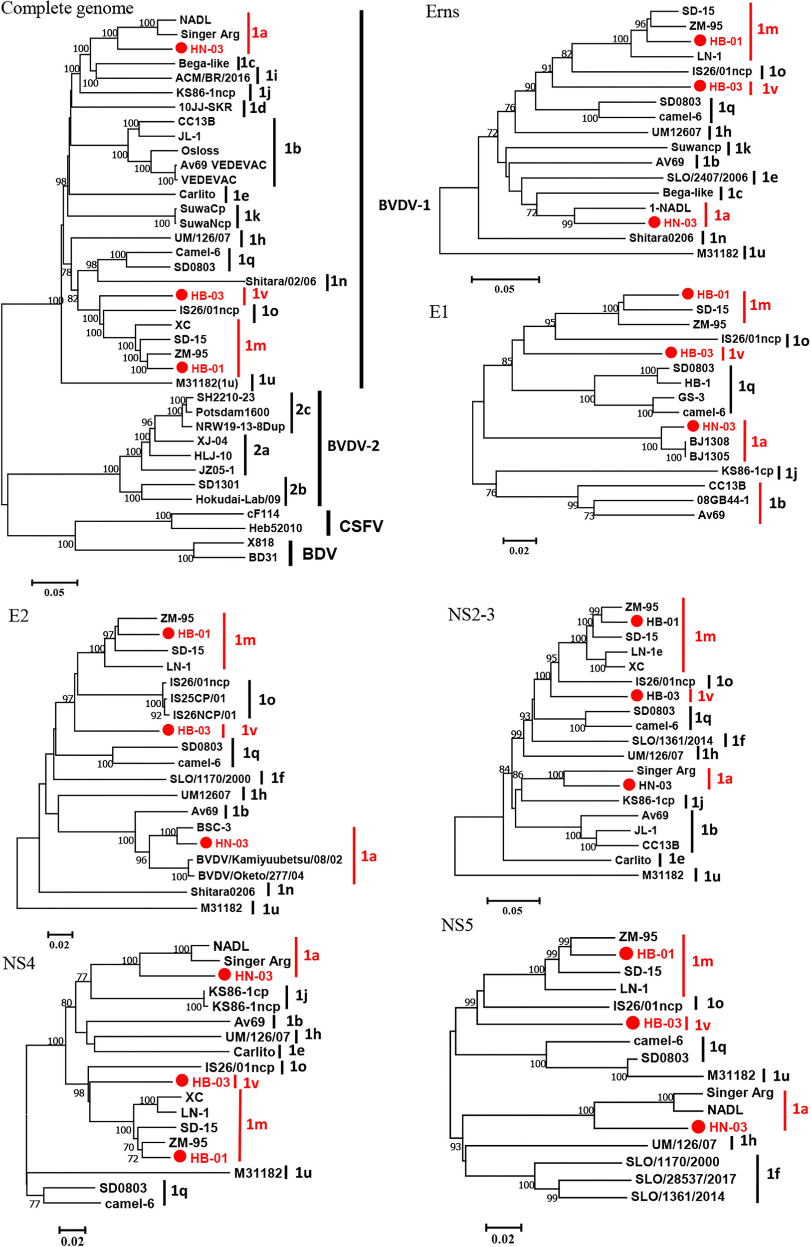Phylogenetic tree of the nucleotide sequences of the complete gene and six segments (Erns, E1, E2, NS2-3, NS4, and NS5). Molecular evolutionary genetics analysis was performed with MEGA 7 (Molecular Evolutionary Genetics Analysis) using the neighbor-joining (NJ) and bootstrap analysis (n = 1,000) method. Unrooted trees described the relationship between sequences retrieved from the GenBank database and the three bovine viral diarrhea virus (BVDV) isolates analyzed in this work (red circle). Information on the reference strains is shown in Supplementary Table 3.