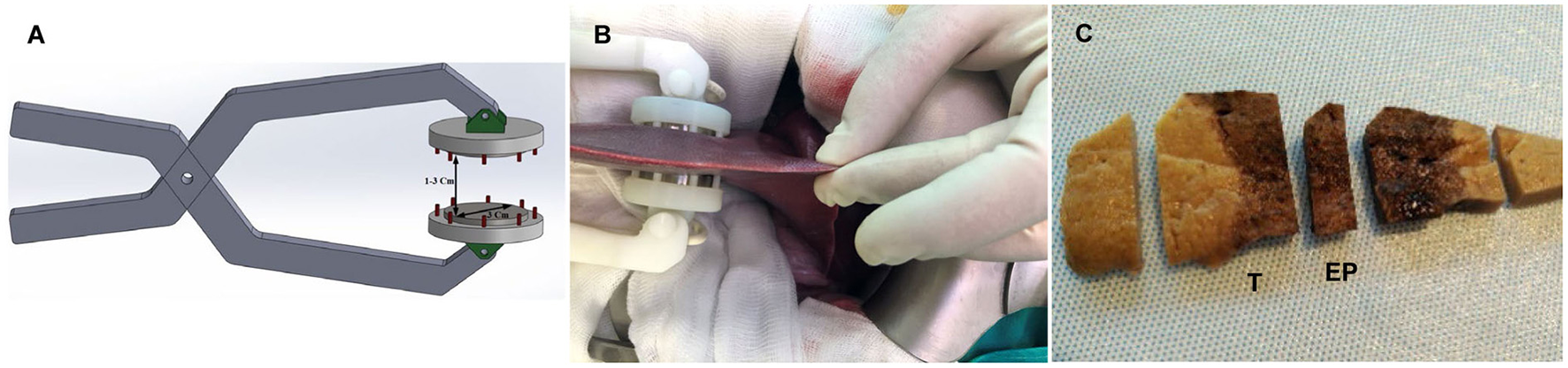 (A) Schematic representation of the electrode. (B) Picture of the electrode and liver lobe positioning during the procedure. (C) Section of fixed porcine liver 1 day after IRE showing a uniform hemorrhagic lesion through the entire ablated zone. (T) sample from the transition zone between treated and non-treated tissue, (EP) sample from the center of the treated zone.